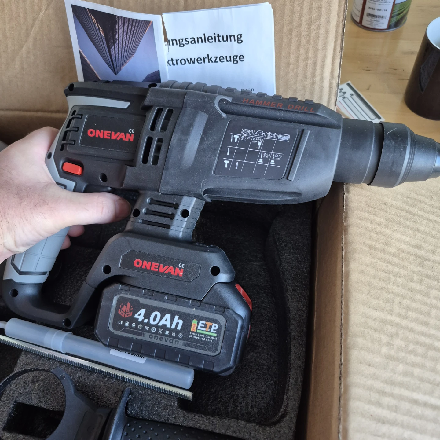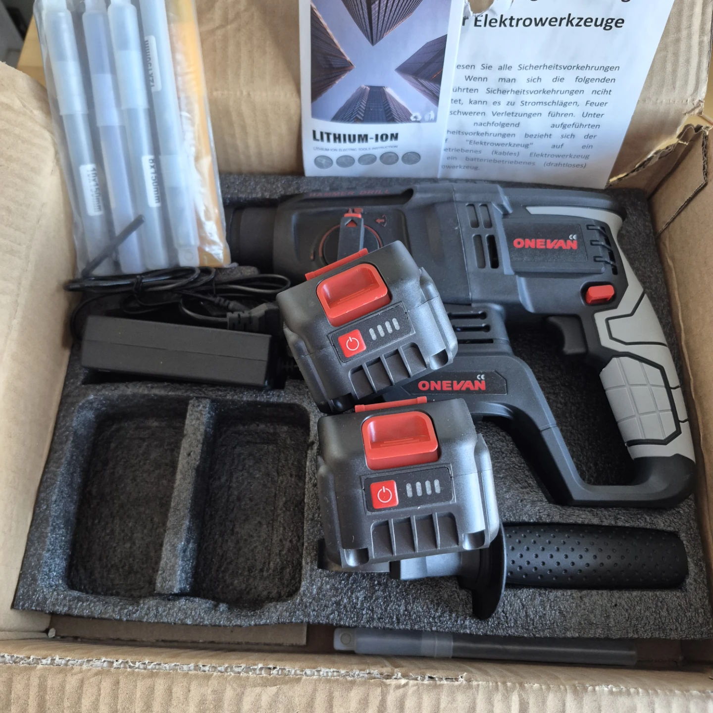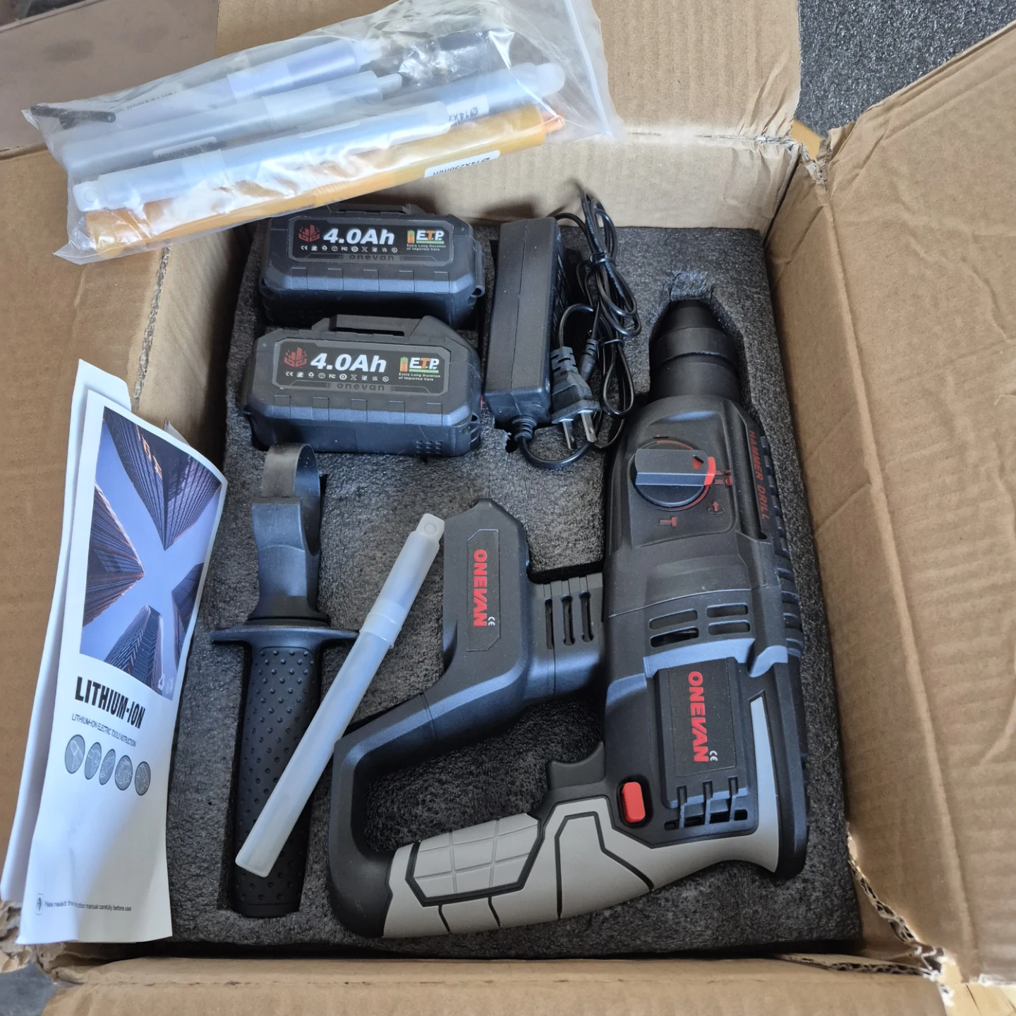 This ONEVAN hammer drill comes with two 4.0Ah lithium-ion batteries and a charger. It includes a chisel bit and extra drill bits. The drill also features a helpful side handle for better control. Great for construction projects!