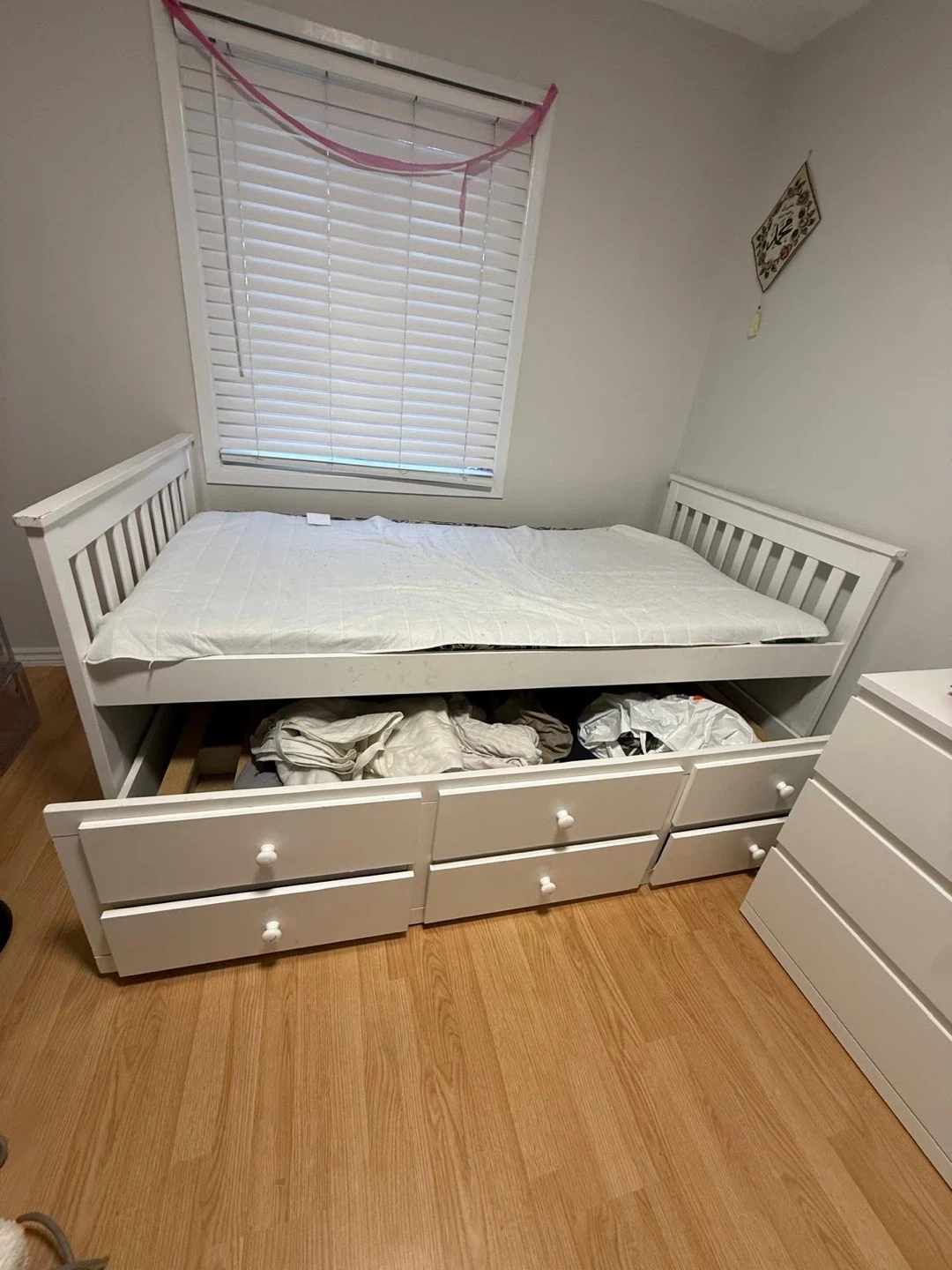 Buy & SellWhite Twin Bed Frame with DrawersWhite Twin Bed Frame with Drawers$150White wooden twin bed frame. It features six drawers underneath for storage. This bed is made of wood.ConditionGoodWHERE TO MEETM4H 1J3View MapSELLERverifiedKiranAmirThorncliffe Park1215 reviews1 chats·1 favorites·37 viewsSEND CHAT TO SELLERHi KiranAmir! I’m interested in your listing.Hi KiranAmir! I’m interested in your listing.Get the Karrot app to chatSign In to chat