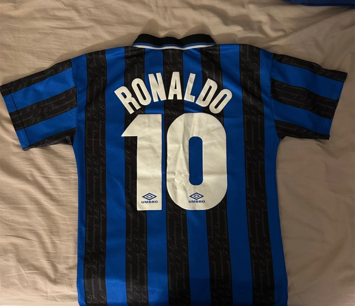 Selling an Umbro Inter Milan jersey with Ronaldo's name and number! It's a blue and black striped jersey with the Umbro and Pirelli logos on the front. A great piece for any football fan or collector!