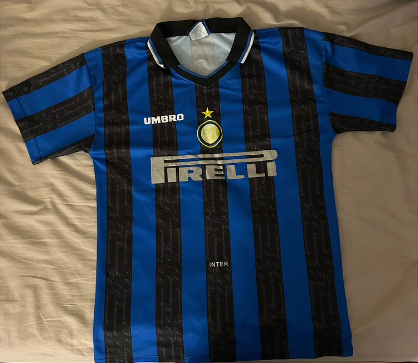 Selling an Umbro Inter Milan jersey with Ronaldo's name and number! It's a blue and black striped jersey with the Umbro and Pirelli logos on the front. A great piece for any football fan or collector!