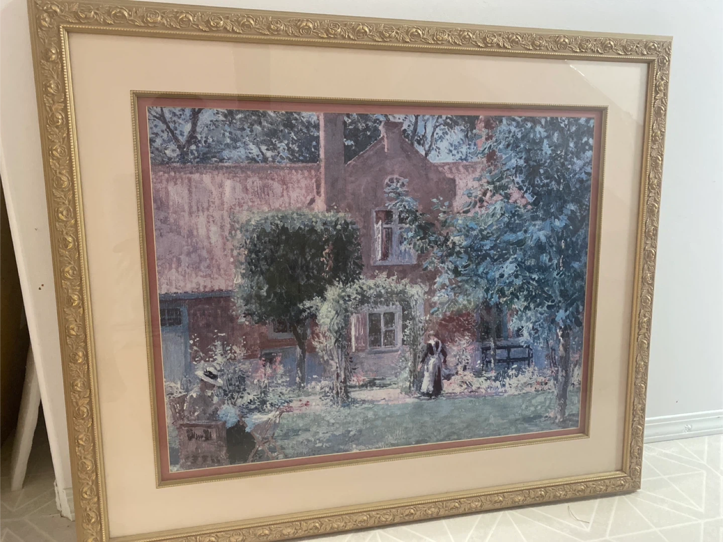 Lovely print featuring a picturesque cottage garden with a woman and dog. It's framed in an ornate gold-coloured frame. Adds a touch of charm to any room! Pick up cash only