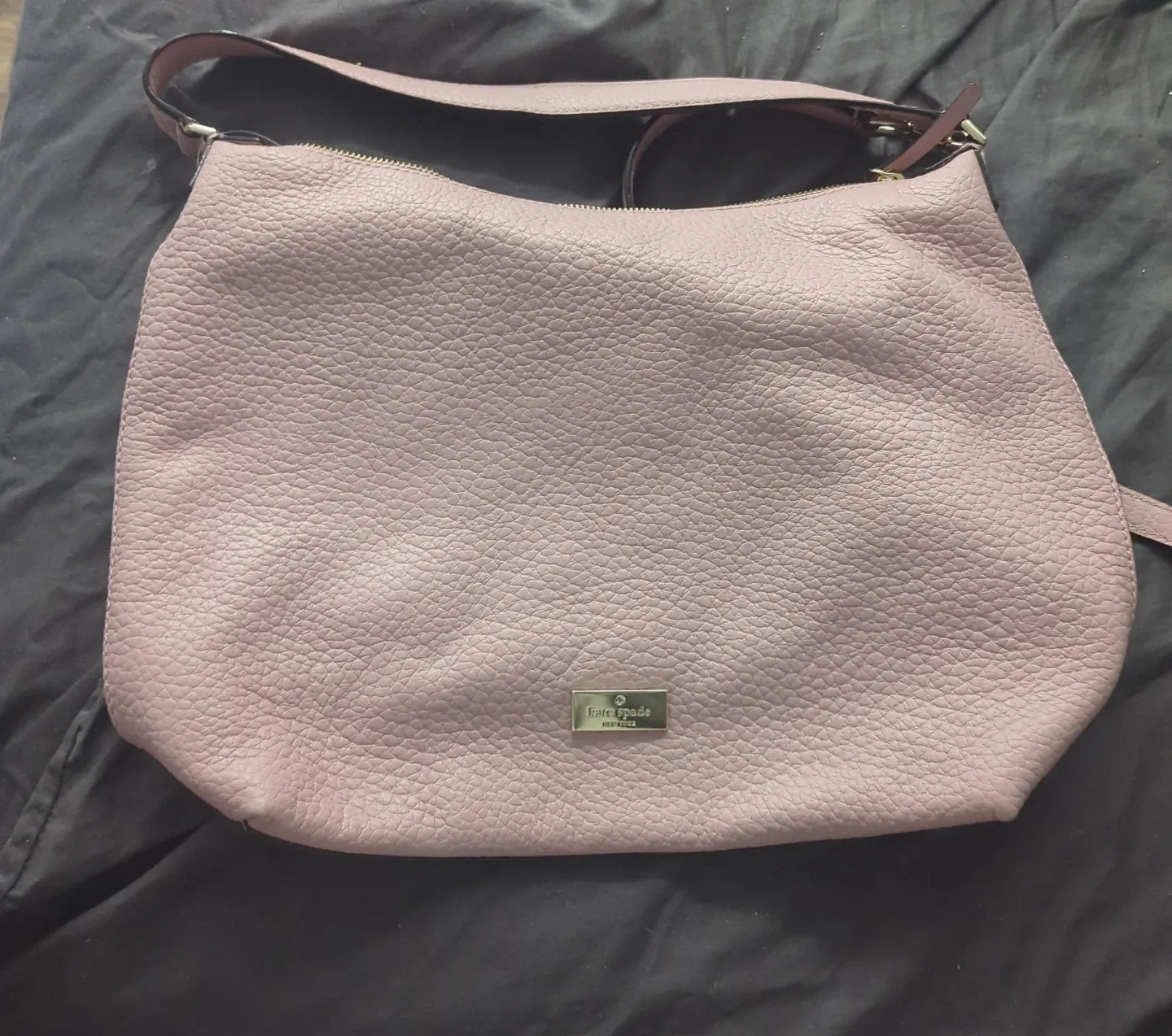 This is a Kate Spade shoulder bag in a dusty rose colour. It's made of pebbled leather. The bag features a zip-top closure. It's a versatile size for everyday use!