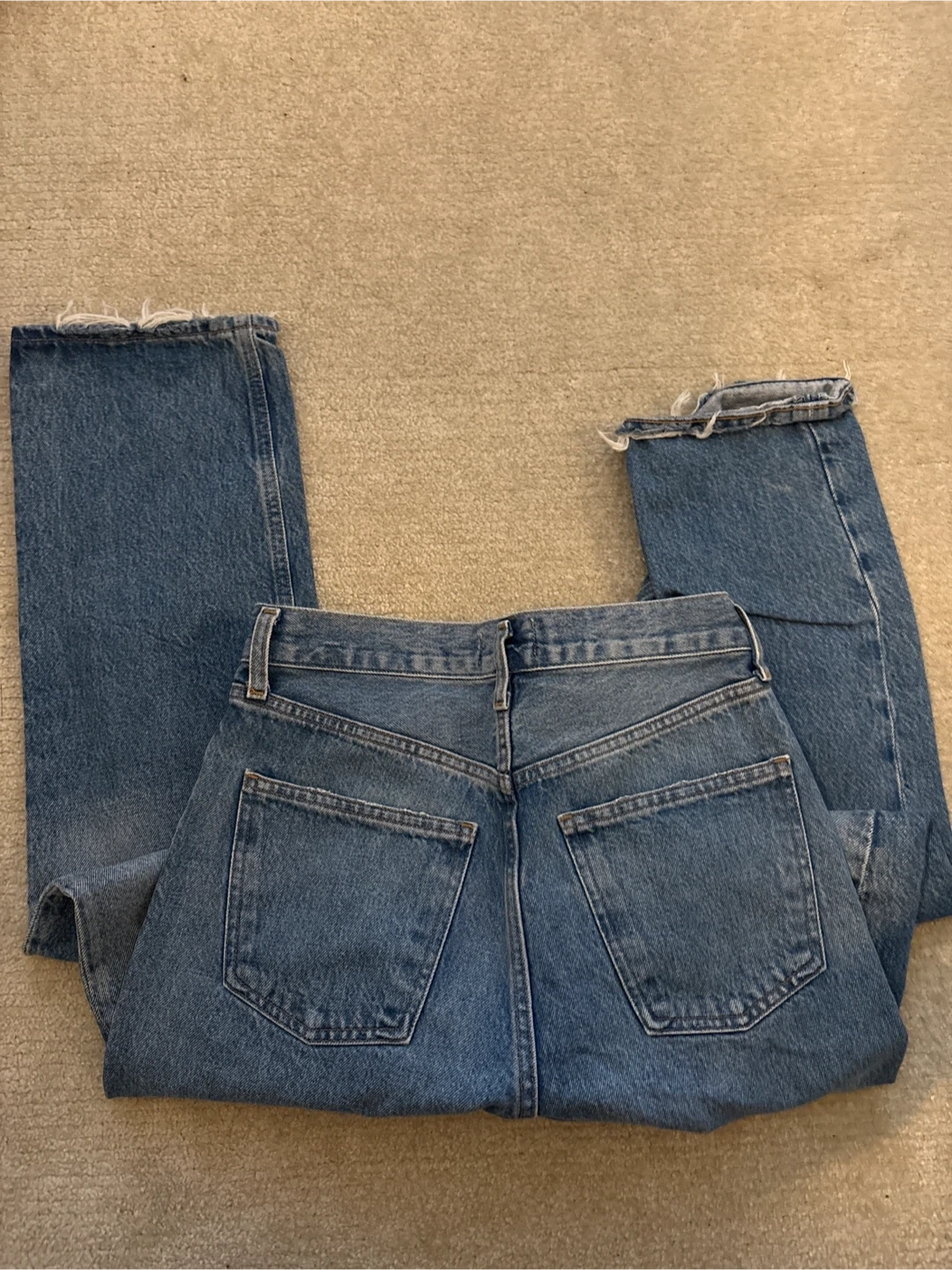 AGOLDE women's denim jeans in a medium wash. These jeans have a button fly and a straight leg cut. Cotton material.