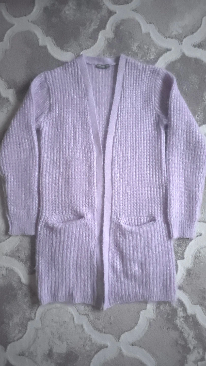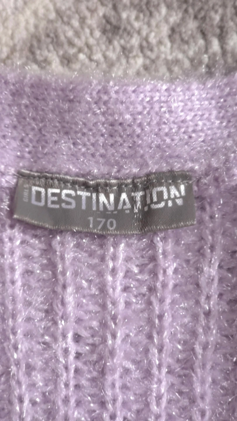 This is a lavender cardigan for girls/women from Destination. It's a size 170 and features a fuzzy, textured knit with two front pockets. It's perfect for layering on cooler days!