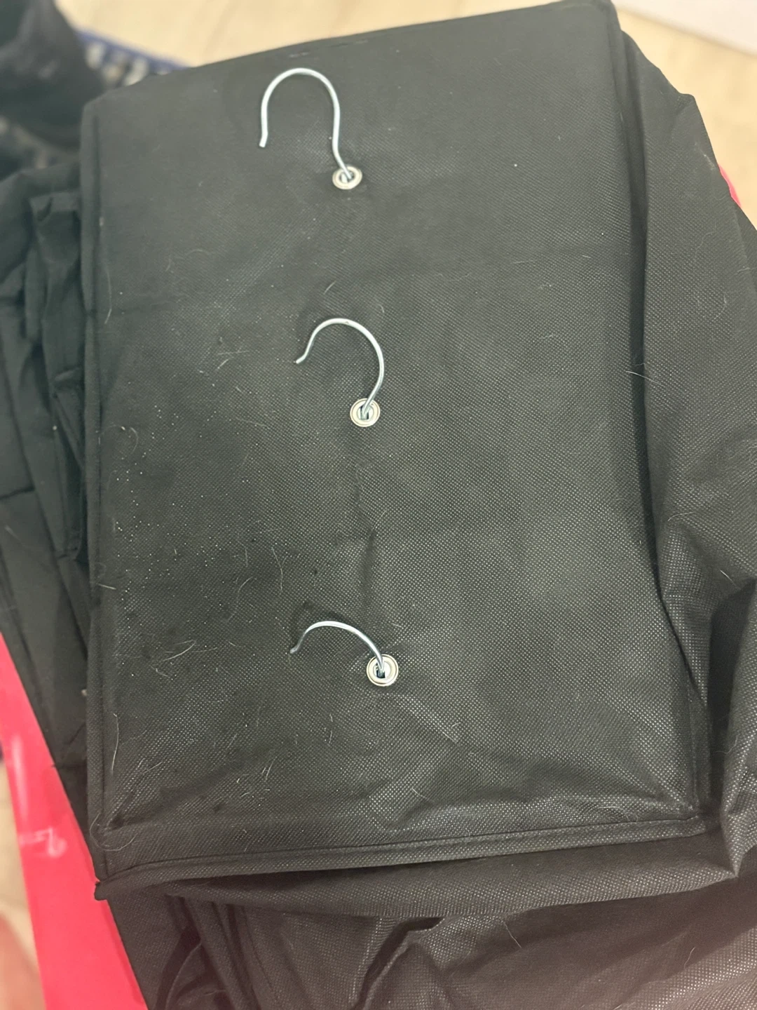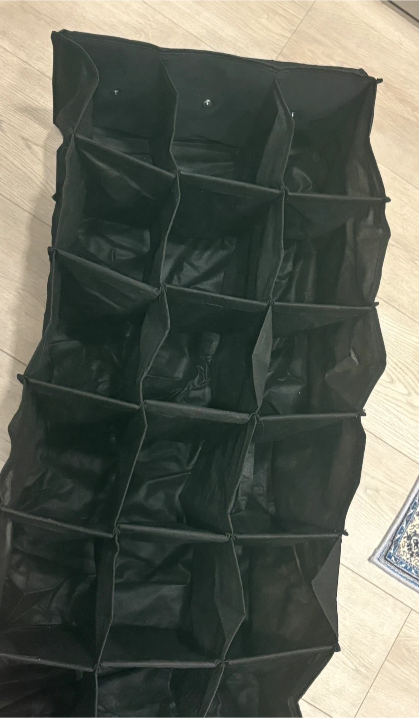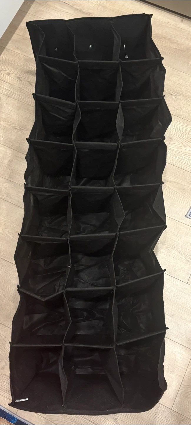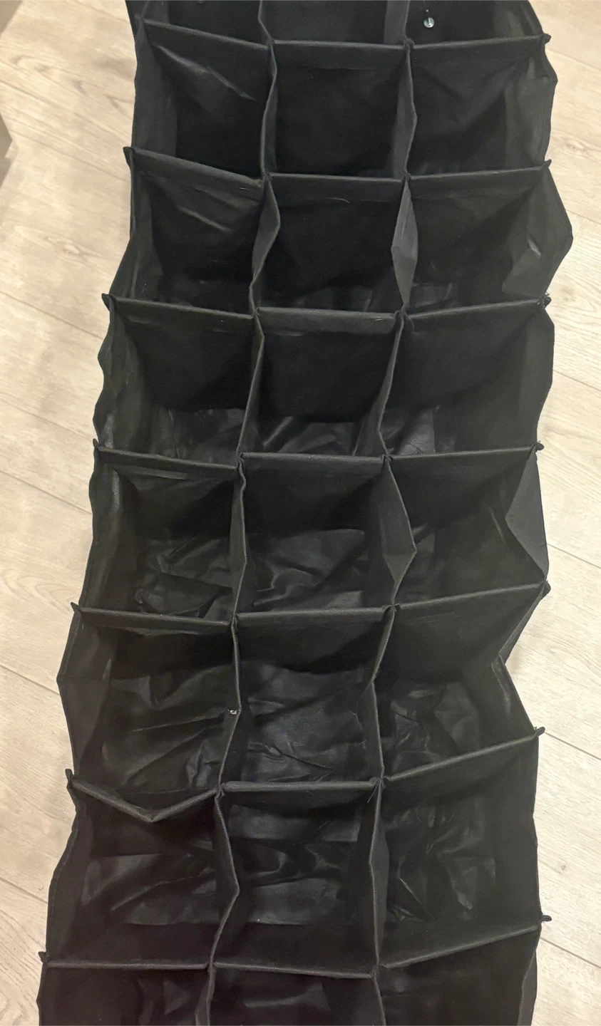 Black fabric hanging closet organizer. It has 24 individual compartments for shoes or accessories. Comes with metal hooks for hanging in a closet.