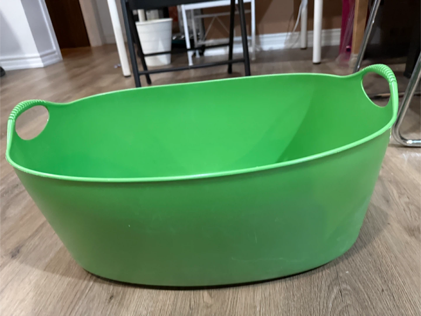 This flexible storage tub is a handy laundry basket or general-purpose container. It's made of durable plastic and has integrated handles for easy carrying. This tub is great for laundry rooms, dorms, or anywhere you need extra storage!