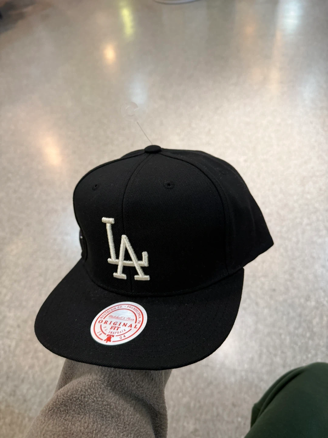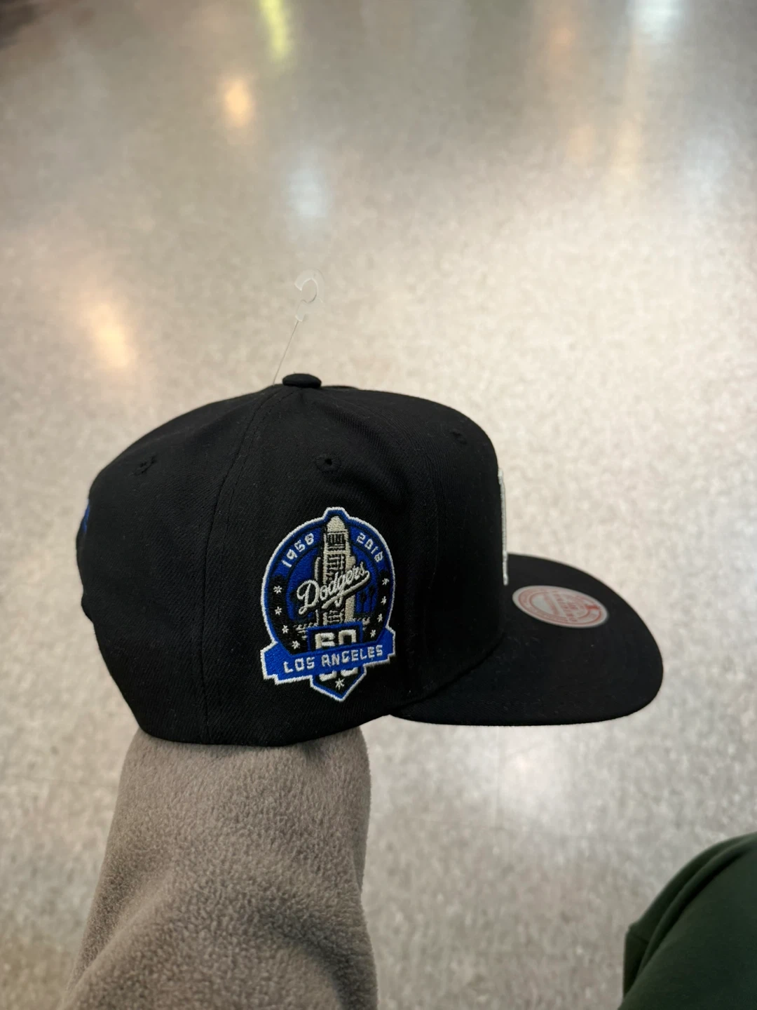 Black snapback hat featuring the LA Dodgers logo. It has 'Mitchell & Ness' embroidered on the back. Adjustable snap closure.