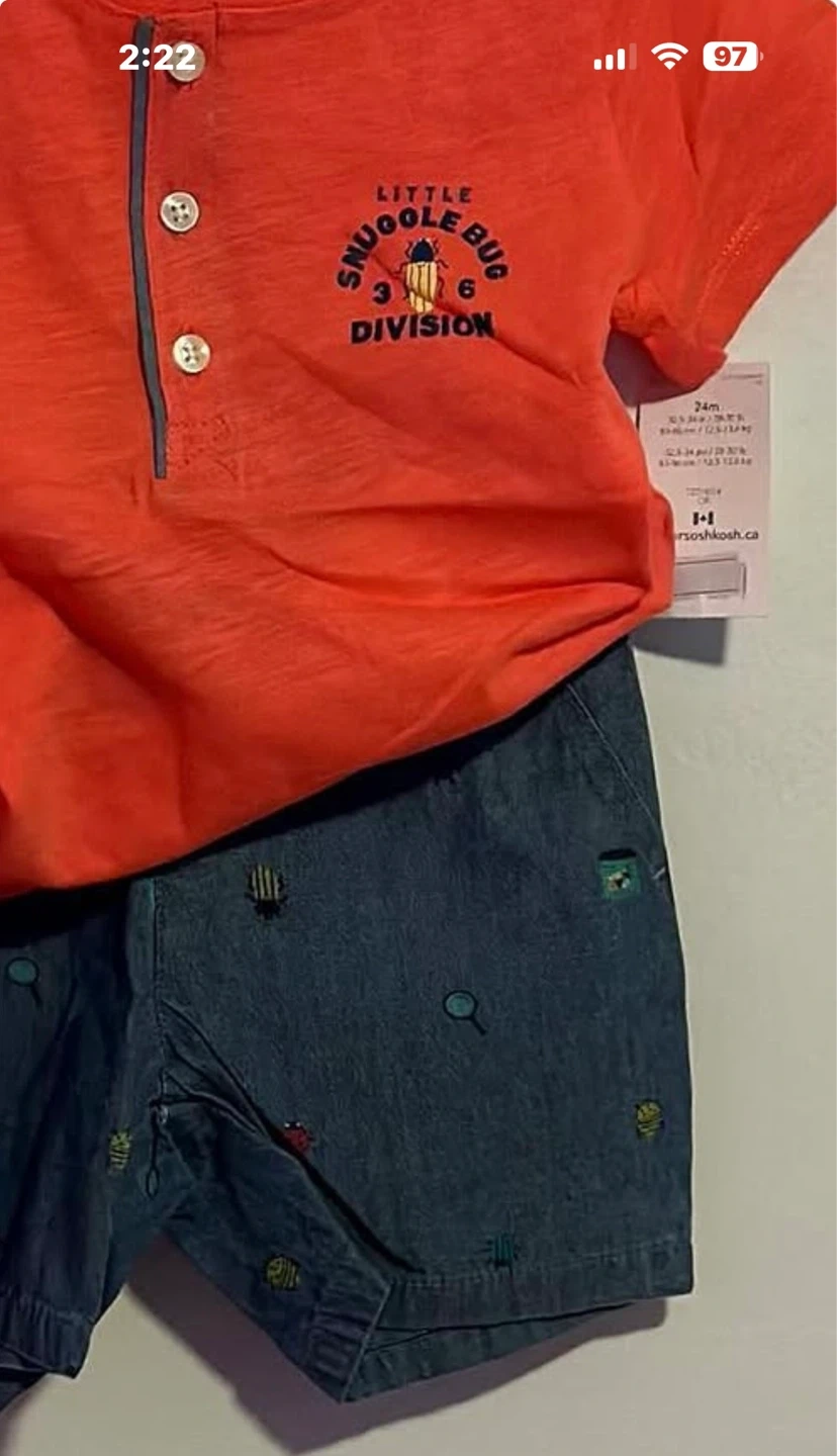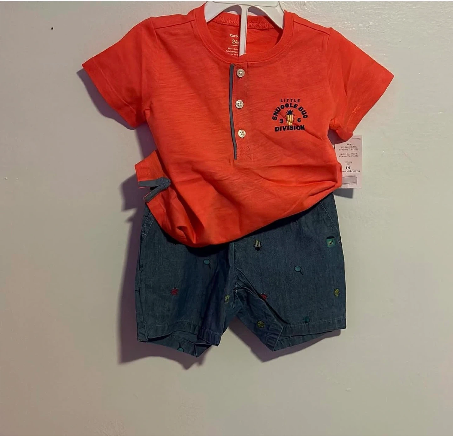 This adorable, brand-new Carter's outfit in size 24 months is perfect for your little one, featuring a cute orange top with a 'Snuggle Bug Division' design and matching denim shorts with embroidered details.