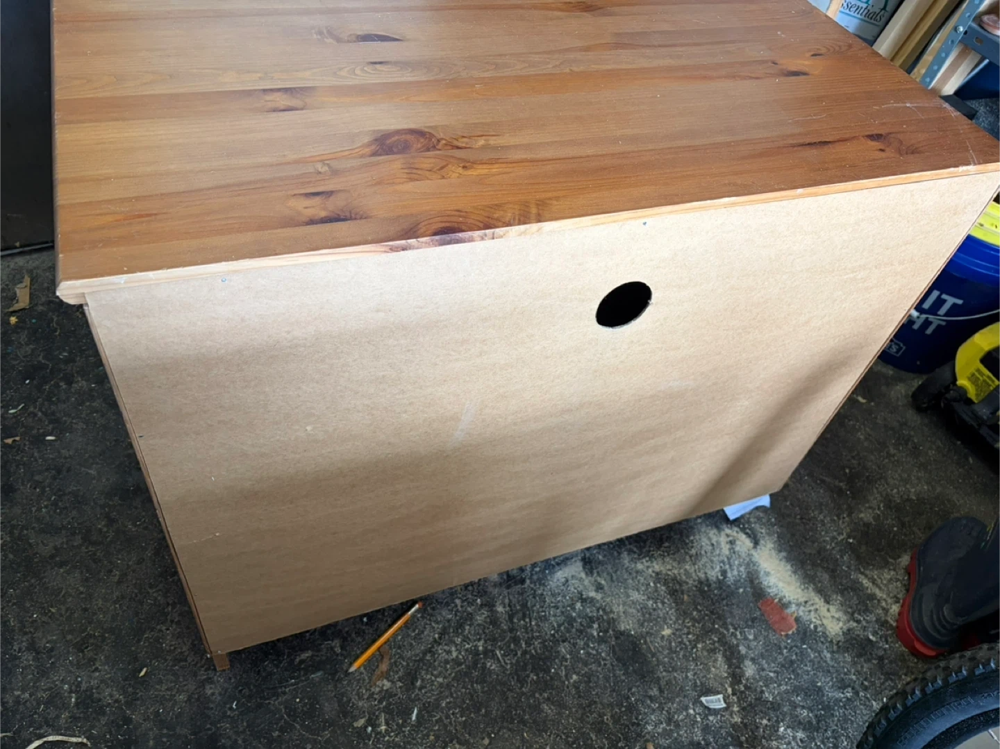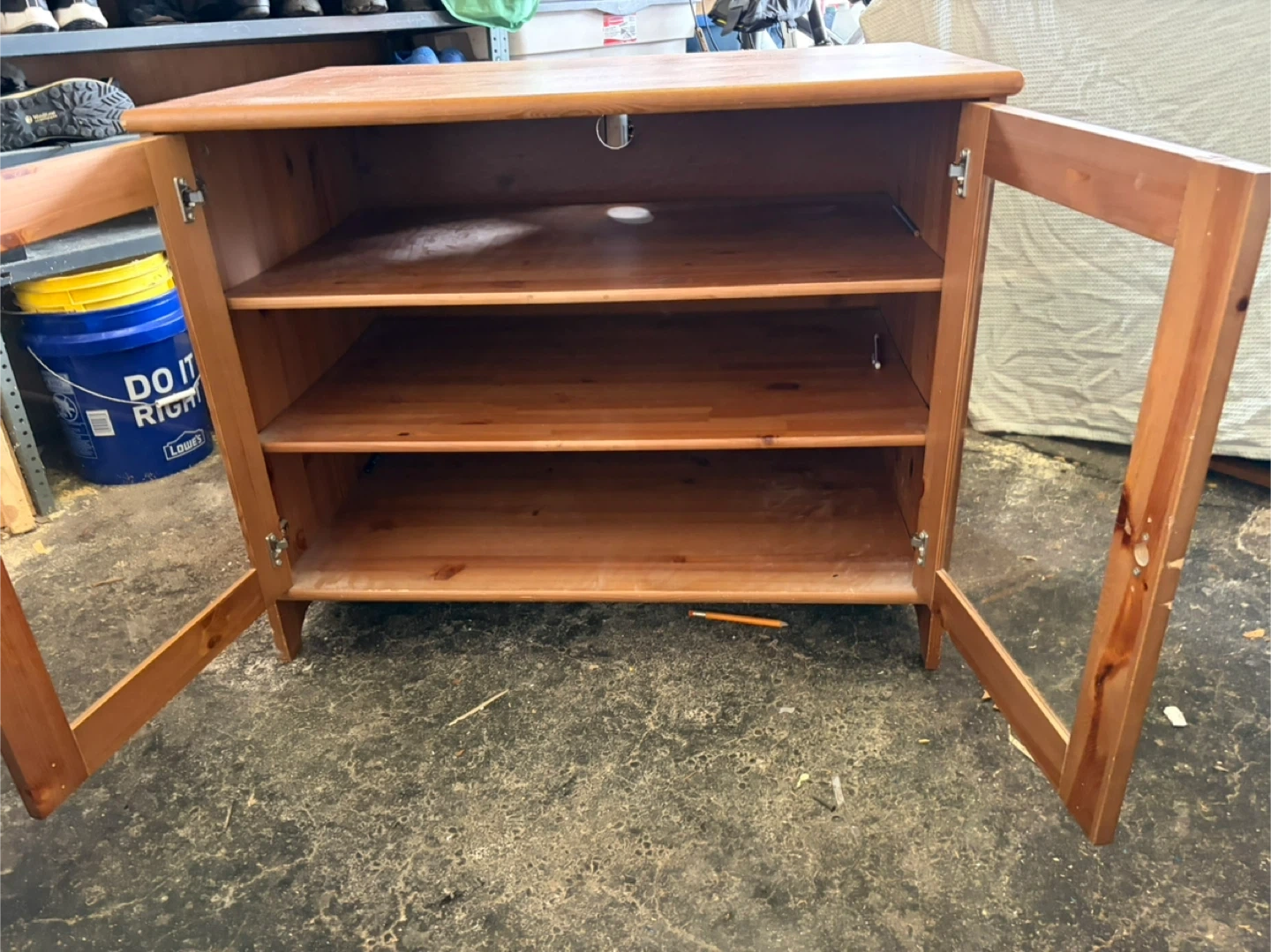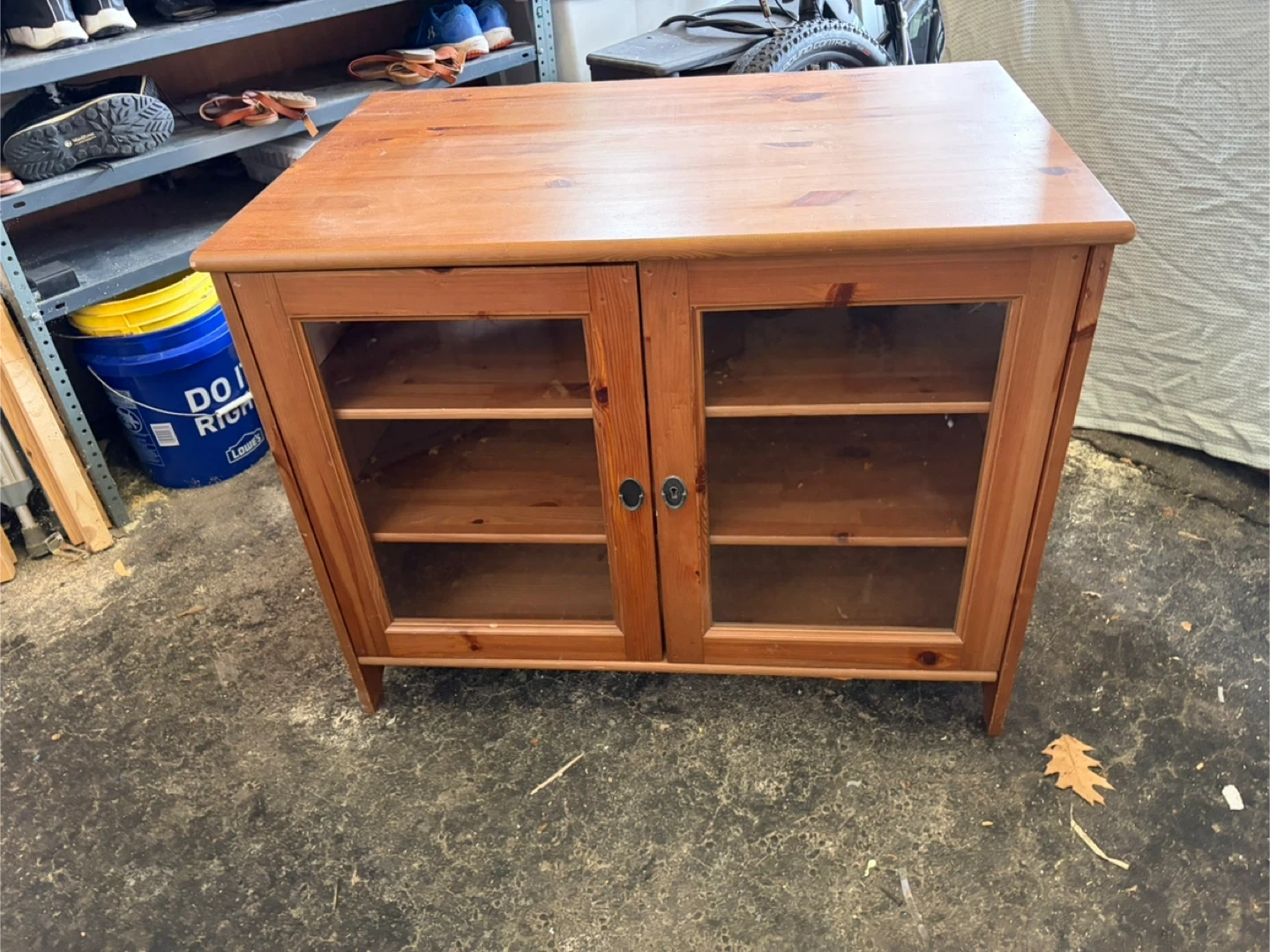 This is a pine wood cabinet with two glass doors. It has adjustable shelves inside and a cable management hole in the back. It's great for media storage or display!