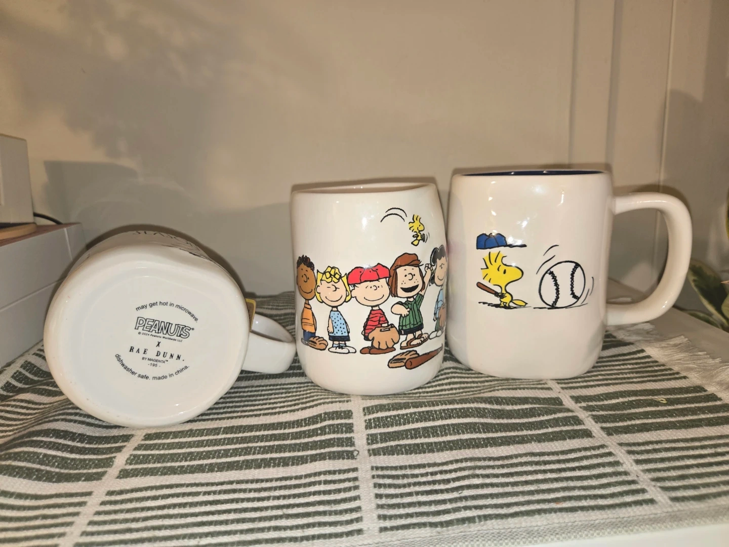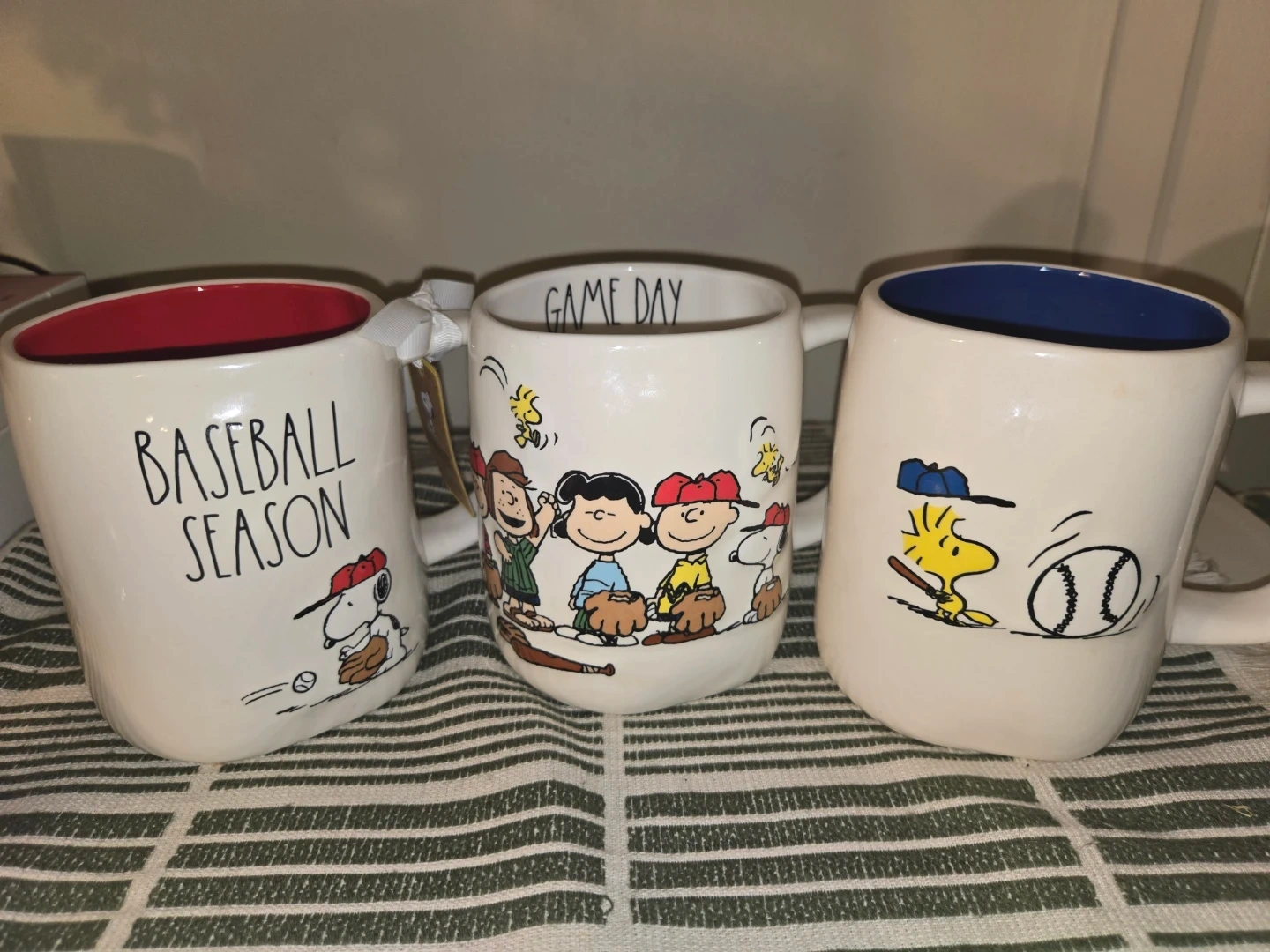This set includes three Rae Dunn ceramic mugs featuring Peanuts characters. One mug says "Baseball Season" and has a red interior. Another features a "Game Day" scene with multiple characters. The third mug says "MVP" and has a blue interior. They're dishwasher and microwave safe.