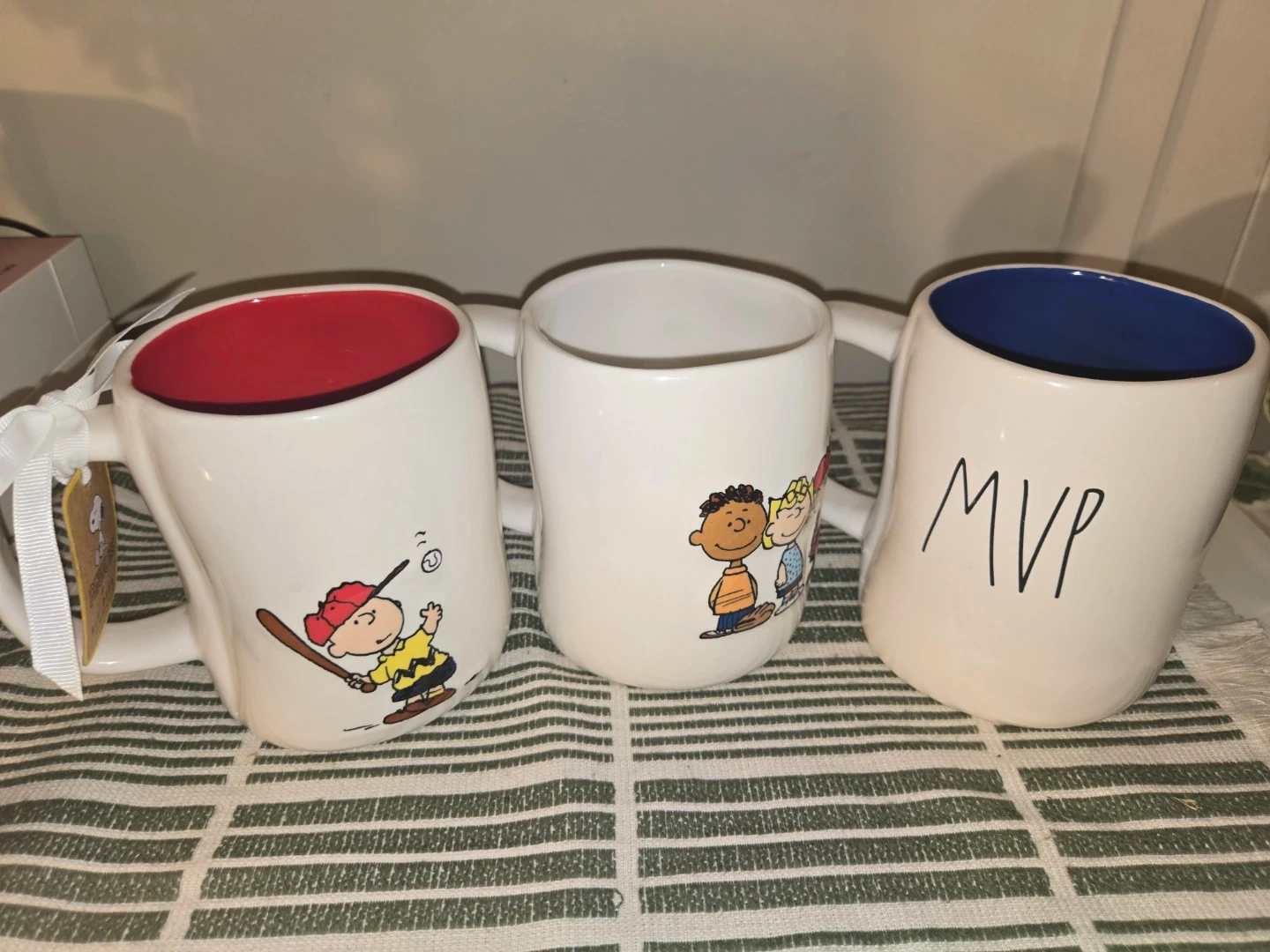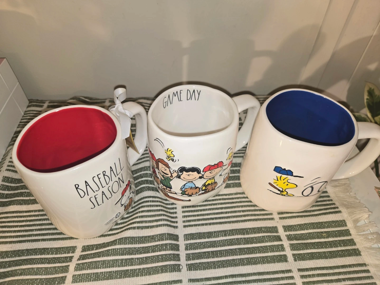 This set includes three Rae Dunn ceramic mugs featuring Peanuts characters. One mug says "Baseball Season" and has a red interior. Another features a "Game Day" scene with multiple characters. The third mug says "MVP" and has a blue interior. They're dishwasher and microwave safe.