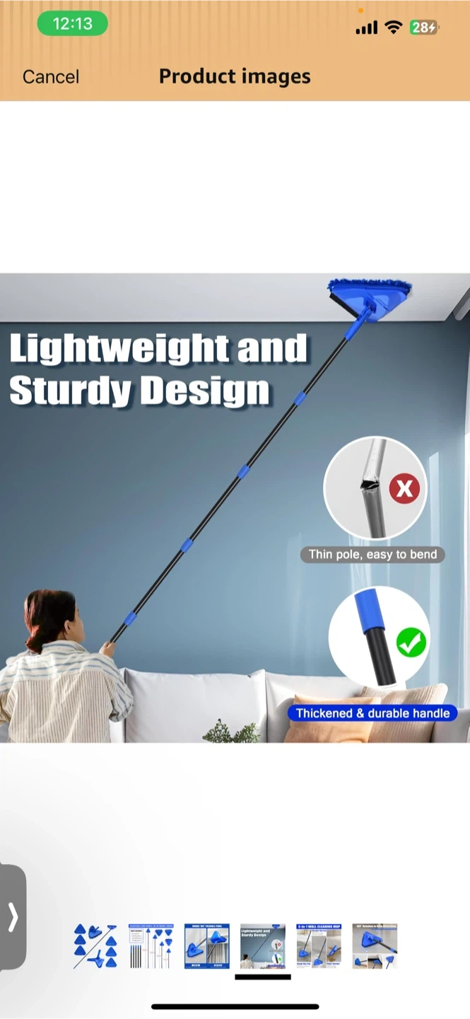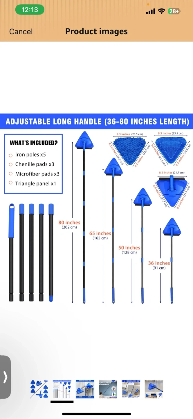 This 3-in-1 wall cleaning mop is designed for versatile cleaning. It features microfiber mop pads for wet and dry use, a rubber squeegee for scraping, and a triangular head with 180° rotation. The lightweight, sturdy design includes an adjustable long handle that extends from 36 to 80 inches.