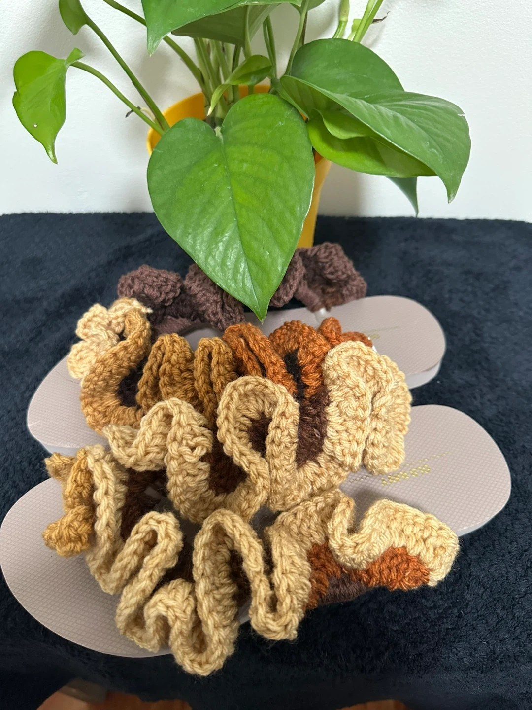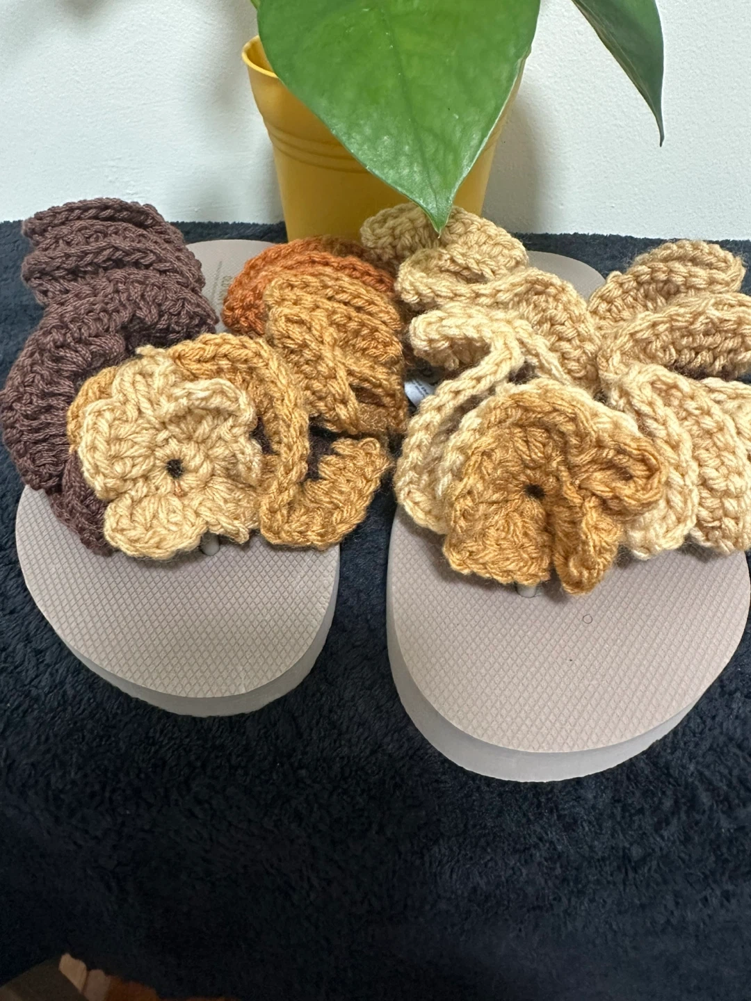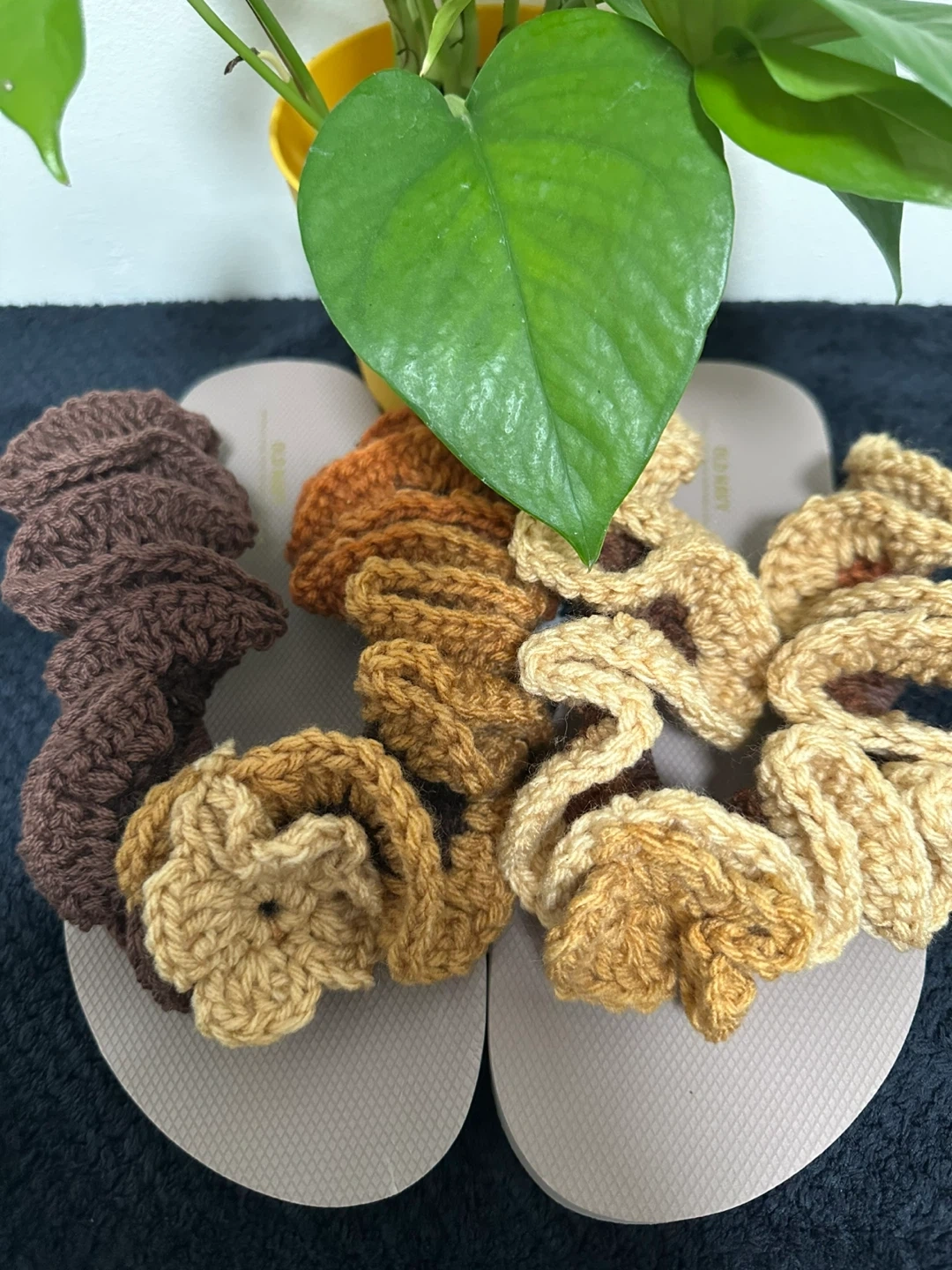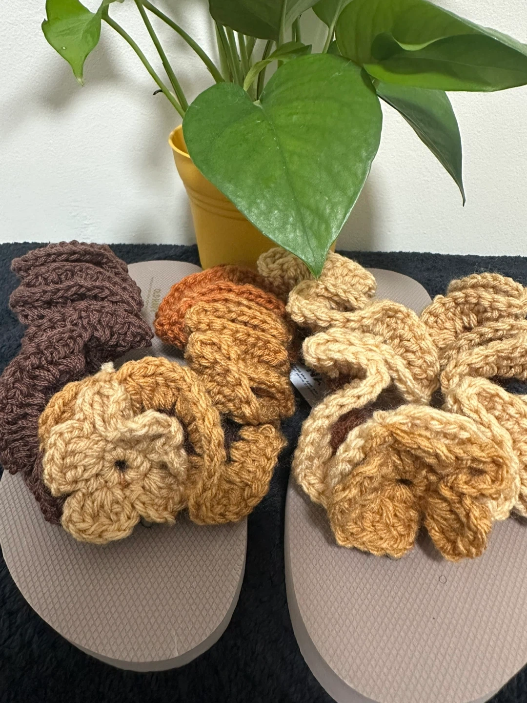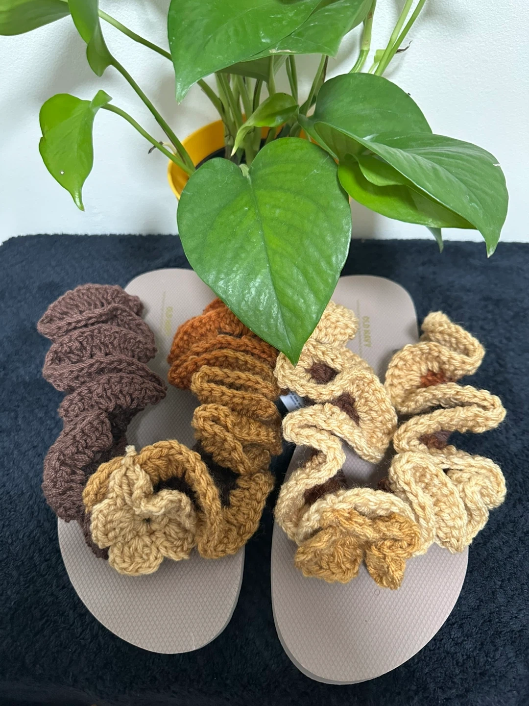 I'm selling a set of five handmade crochet flip flops. They come in lovely earth tones. Perfect for adding a cozy touch to your outfit.