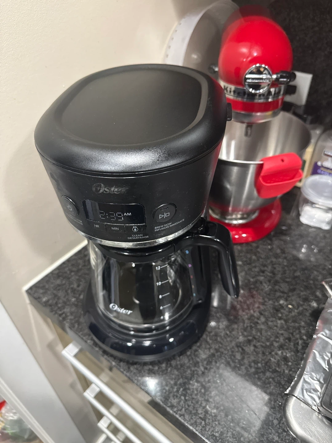 This Oster coffee maker is in black. It has programmable brew settings and a removable filter basket. Great for brewing your morning coffee!