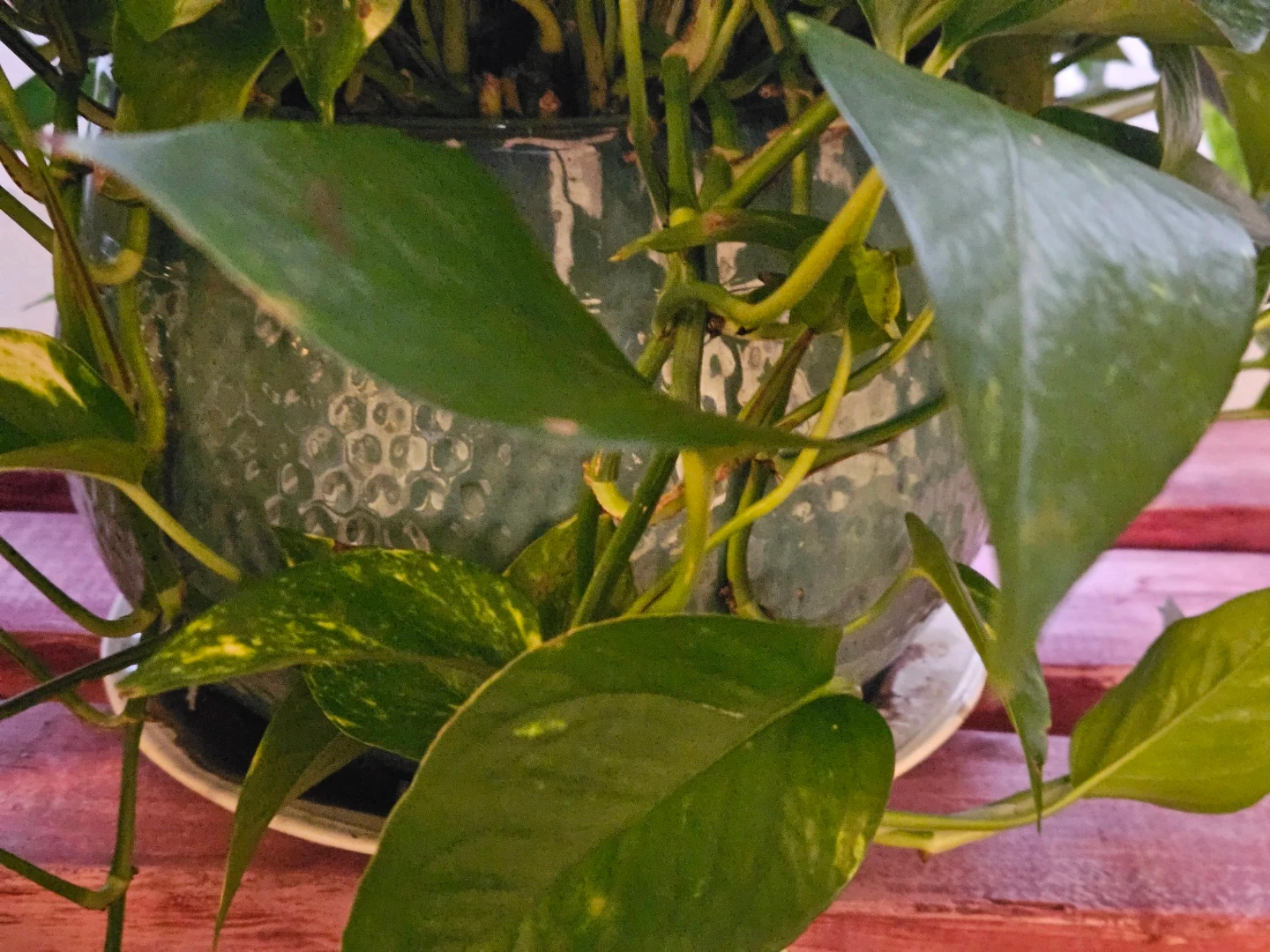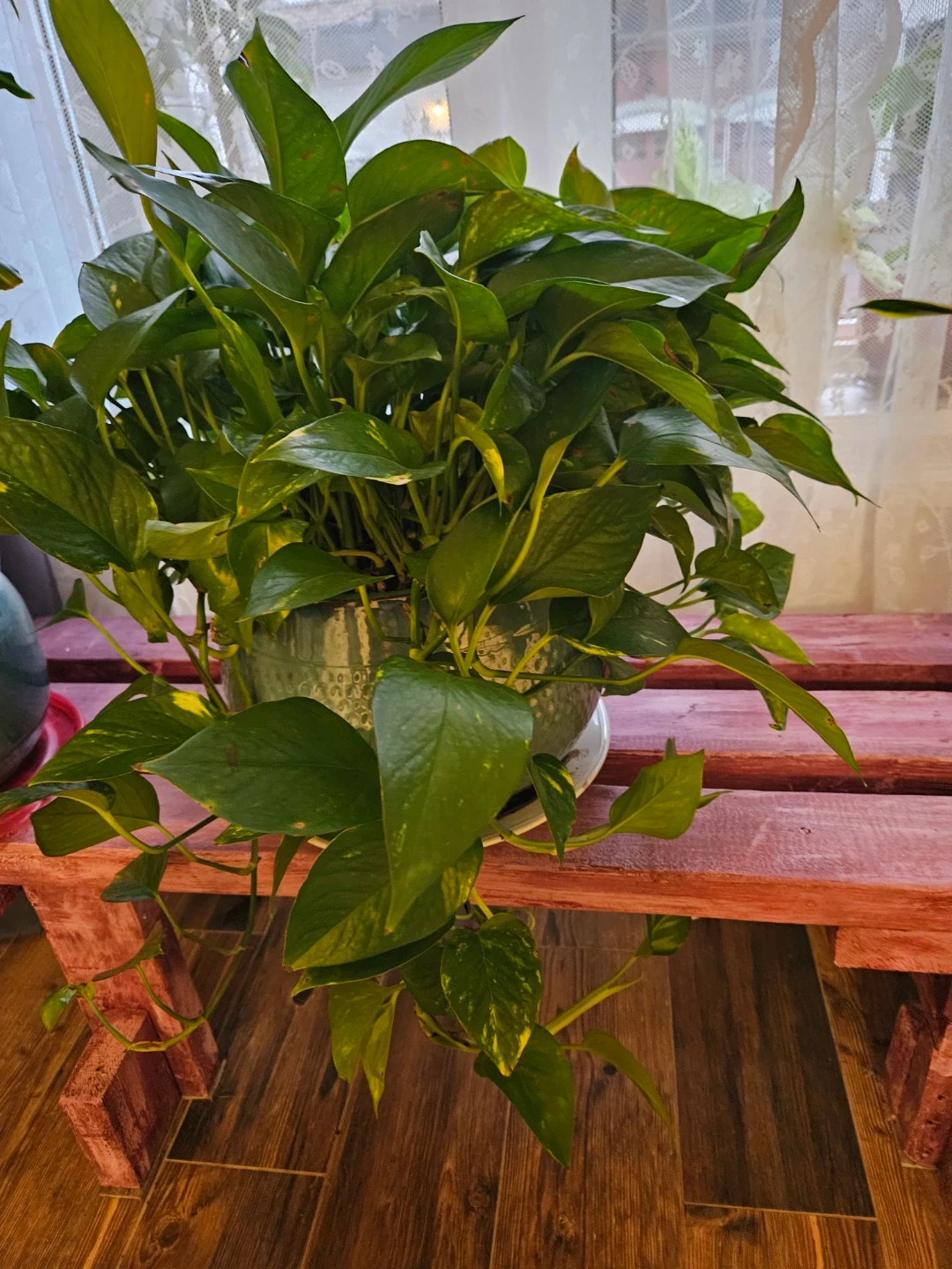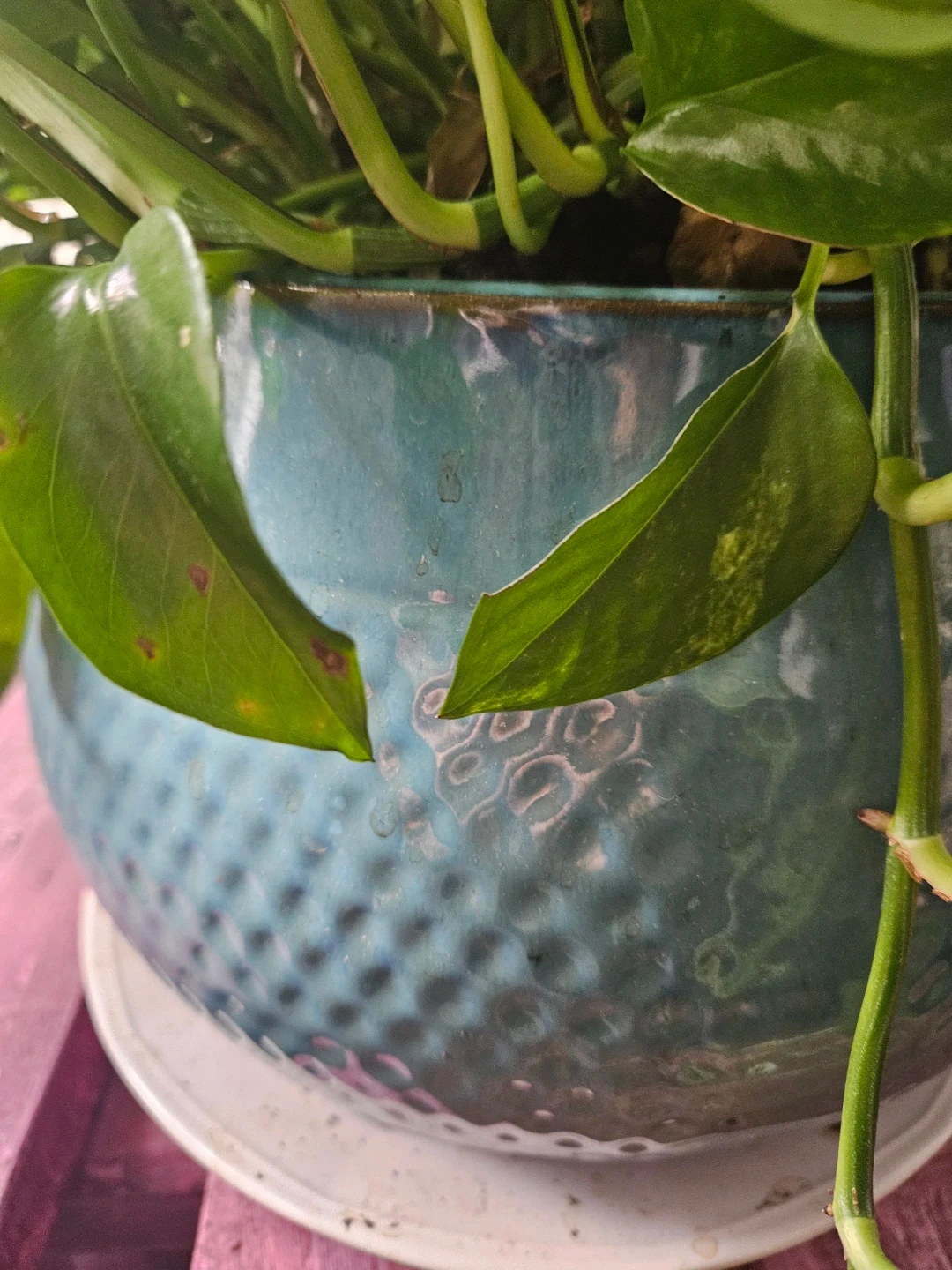 A healthy Golden Pothos plant housed in a decorative blue ceramic pot. It's a low-maintenance plant that thrives indoors. It would be a lovely addition to any home!