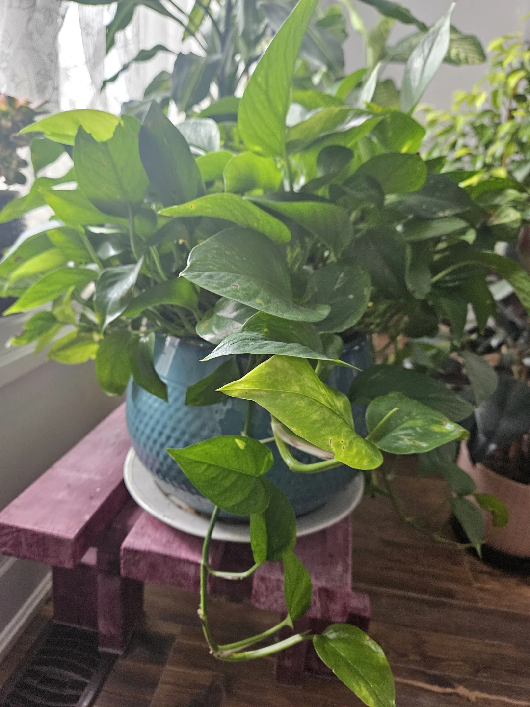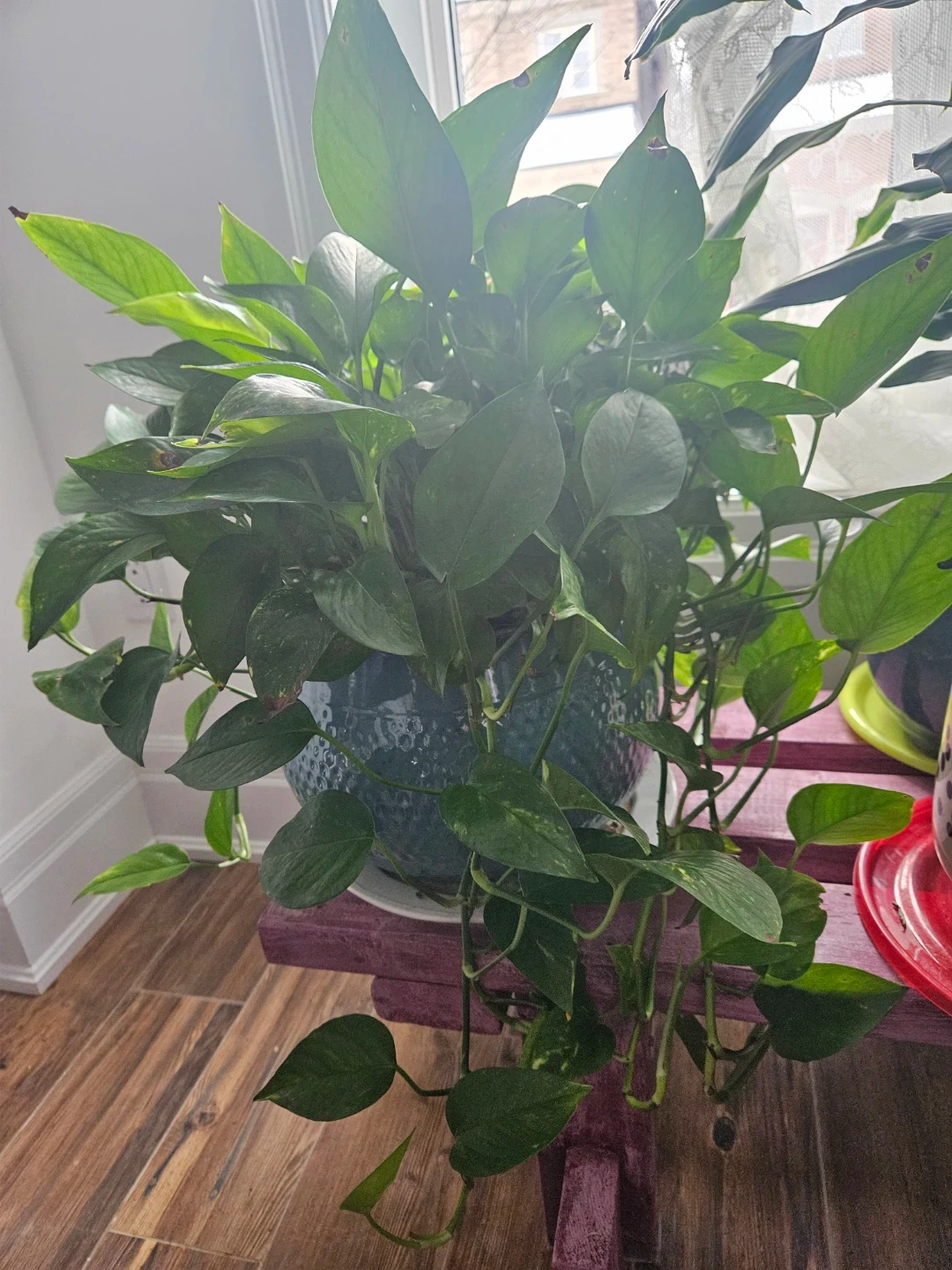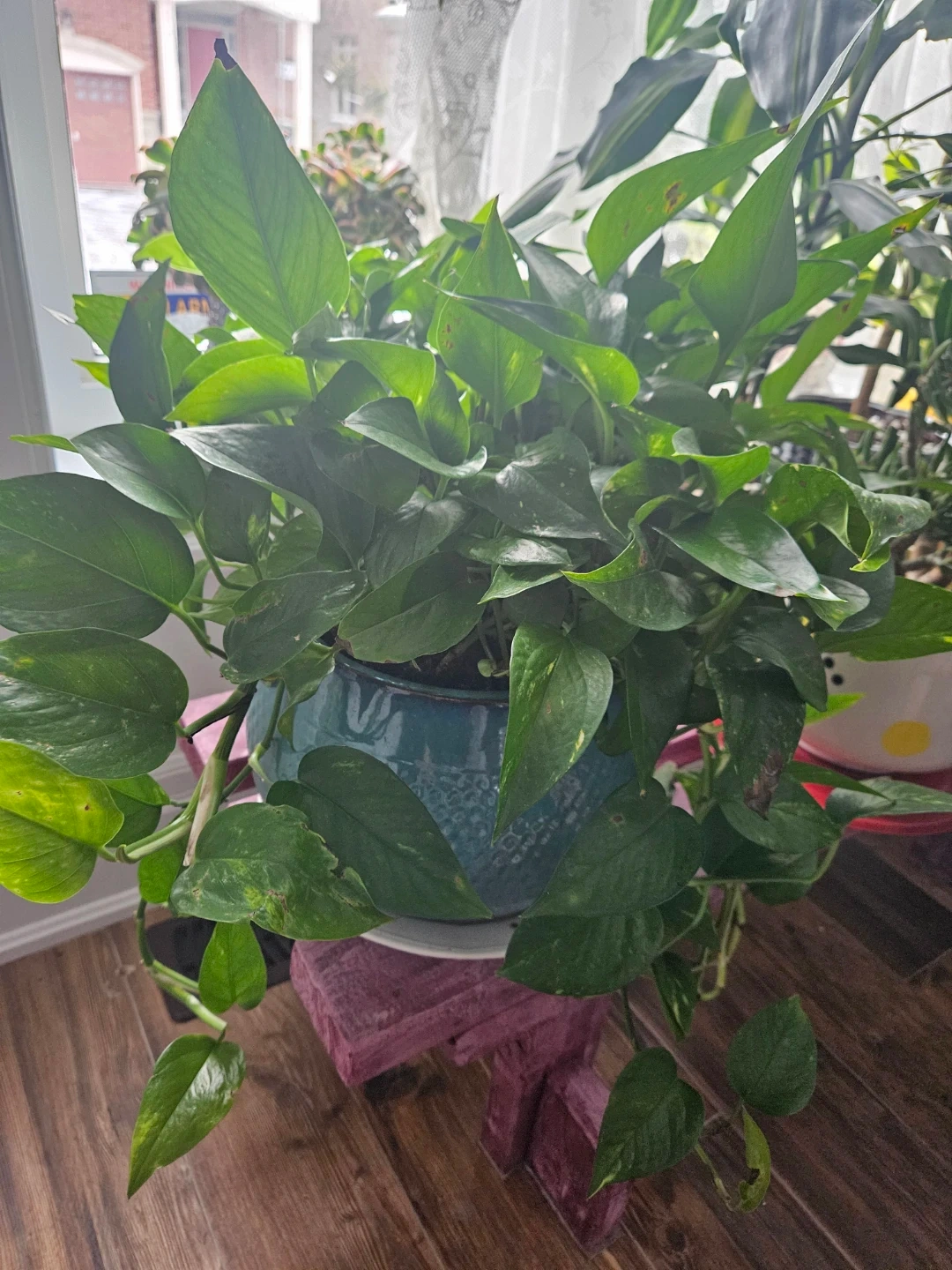 A healthy Golden Pothos plant housed in a decorative blue ceramic pot. It's a low-maintenance plant that thrives indoors. It would be a lovely addition to any home!