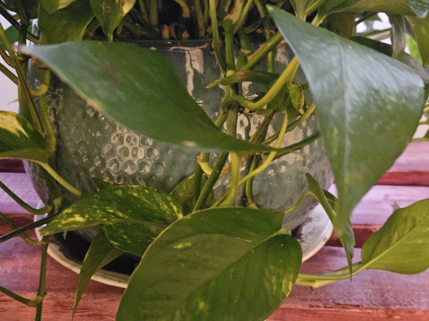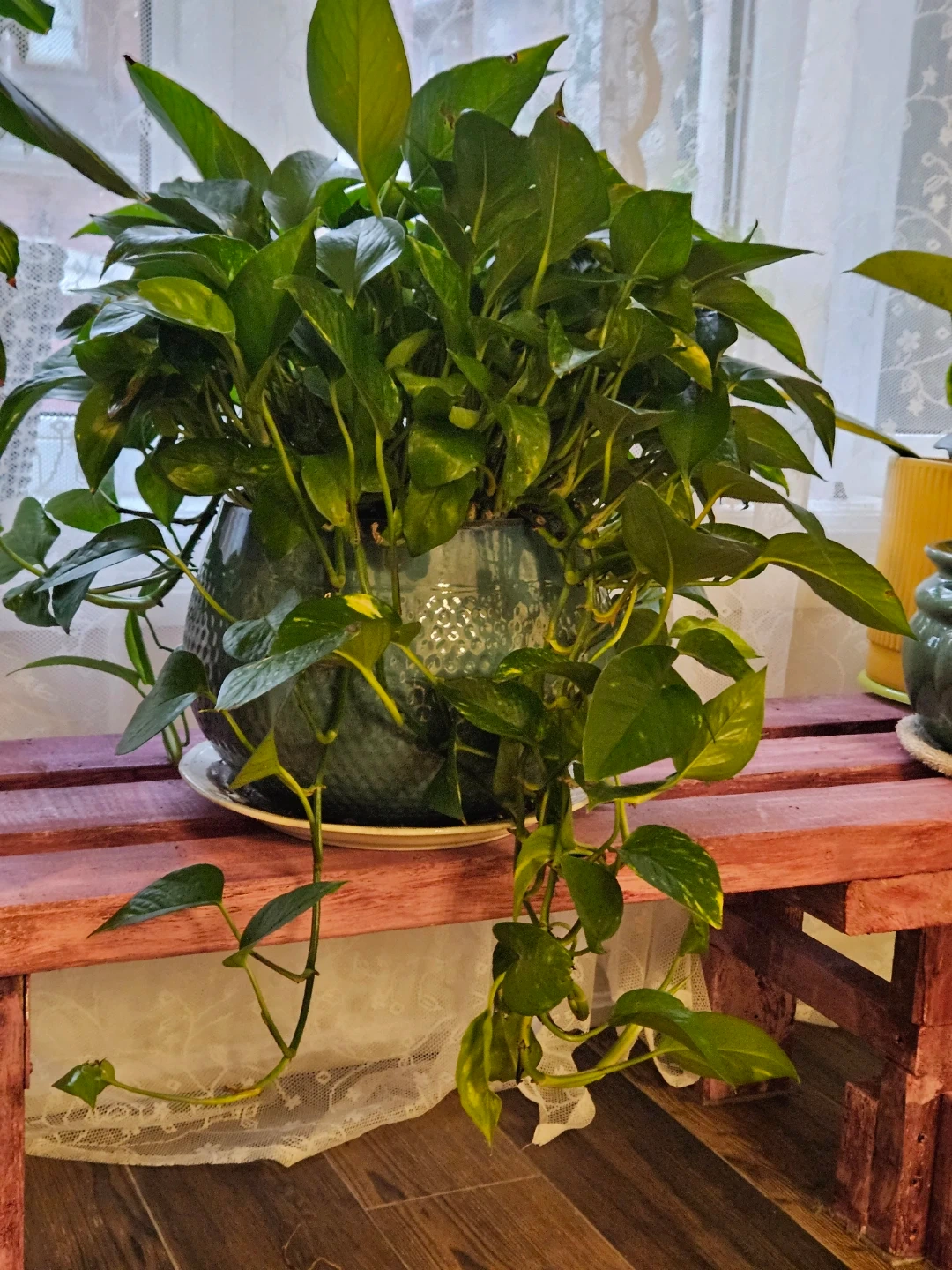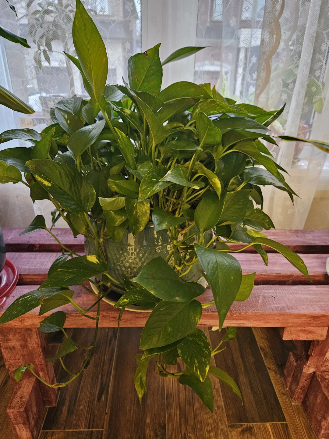A healthy Golden Pothos plant housed in a decorative blue ceramic pot. It's a low-maintenance plant that thrives indoors. It would be a lovely addition to any home!