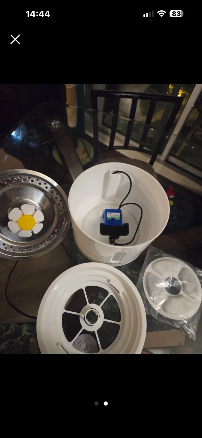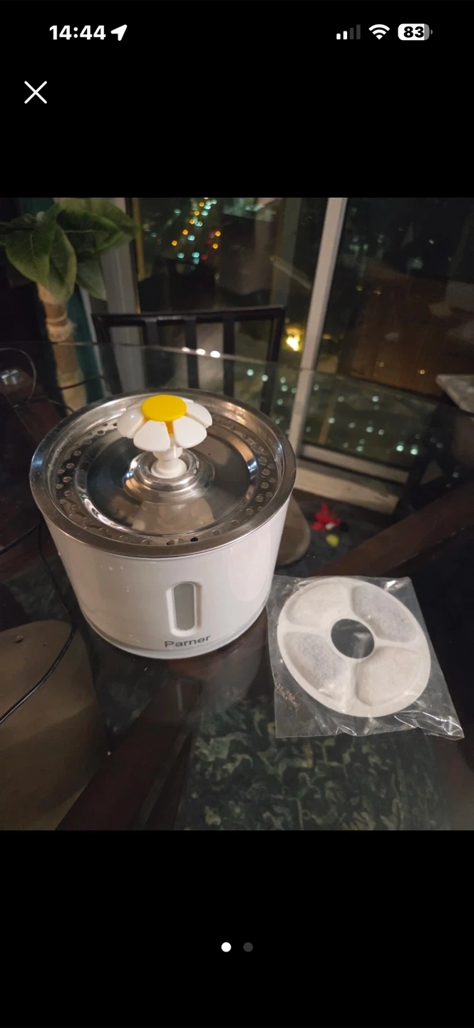 This Pamer pet water fountain provides fresh, circulating water for your furry friends. It includes a pump and a replacement filters. The unit has a flower-shaped spout.