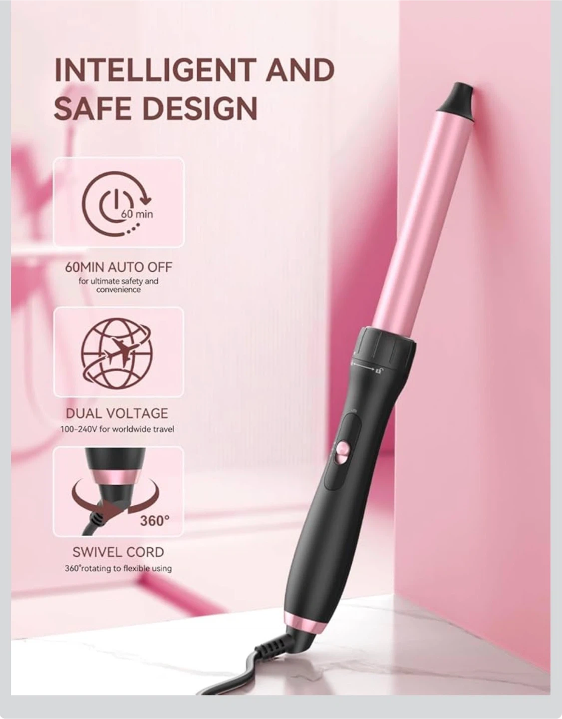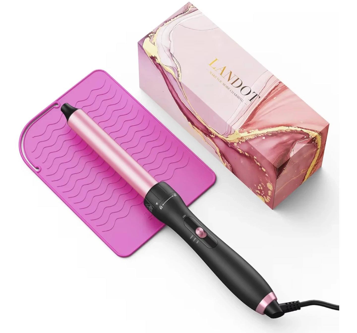 This is a 1-inch curling wand from LANDOT. It offers two temperature settings: 410°F (210°C) for coarse hair and 356°F (180°C) for soft hair. It features a 60-minute auto-off function and a 360° swivel cord for flexible use.