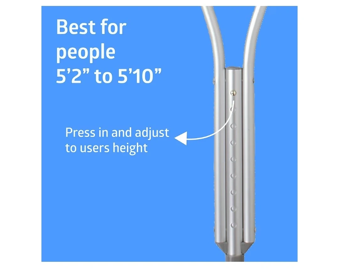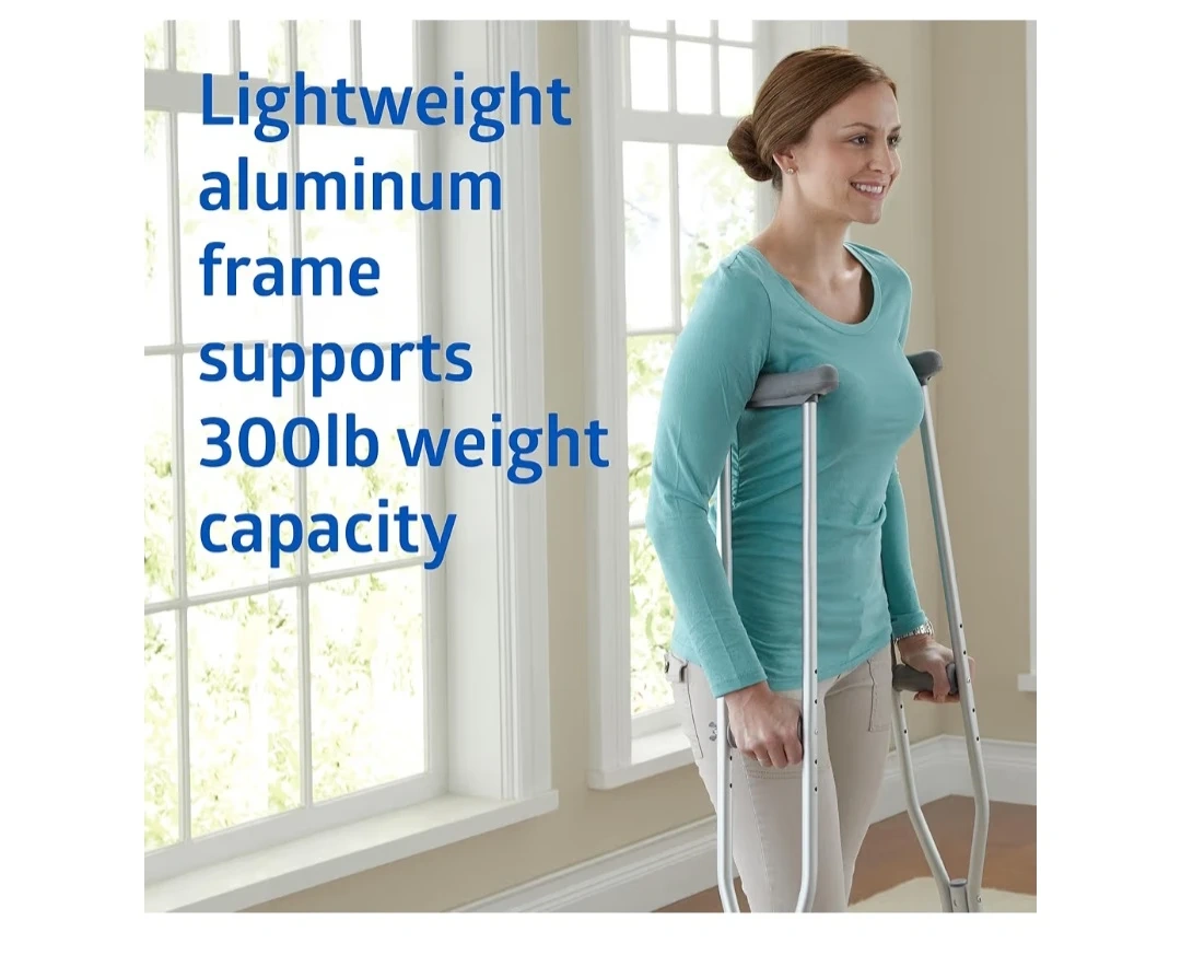 Selling a pair of adjustable aluminum crutches. They're lightweight and can support up to 300 lbs. The height is adjustable for people between 5'2" and 5'10". The handle height is also adjustable. Comes with the original box