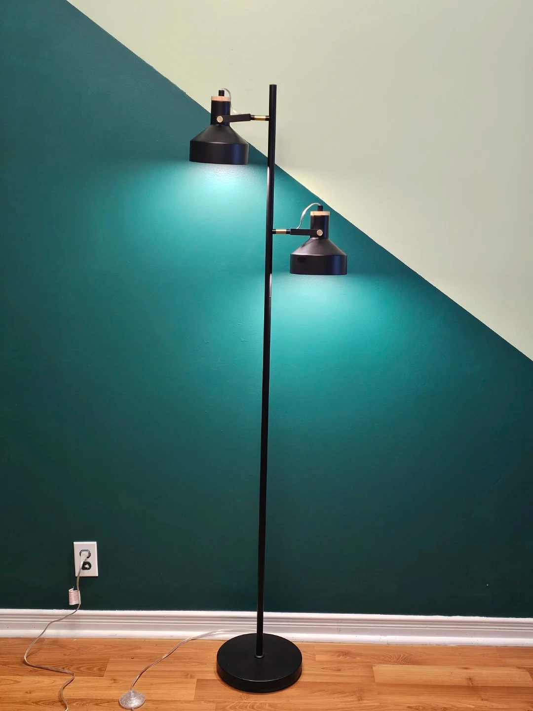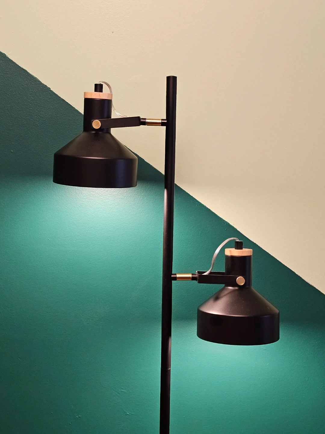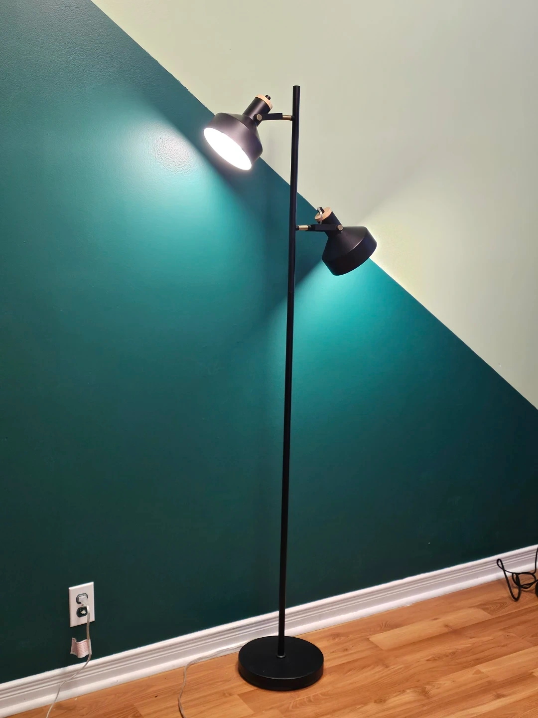 This black double-head floor lamp features adjustable lampshades with natural wood accents. Its slim profile and dual lighting make it a versatile addition to any room. Perfect for providing focused light for reading or ambient lighting.
