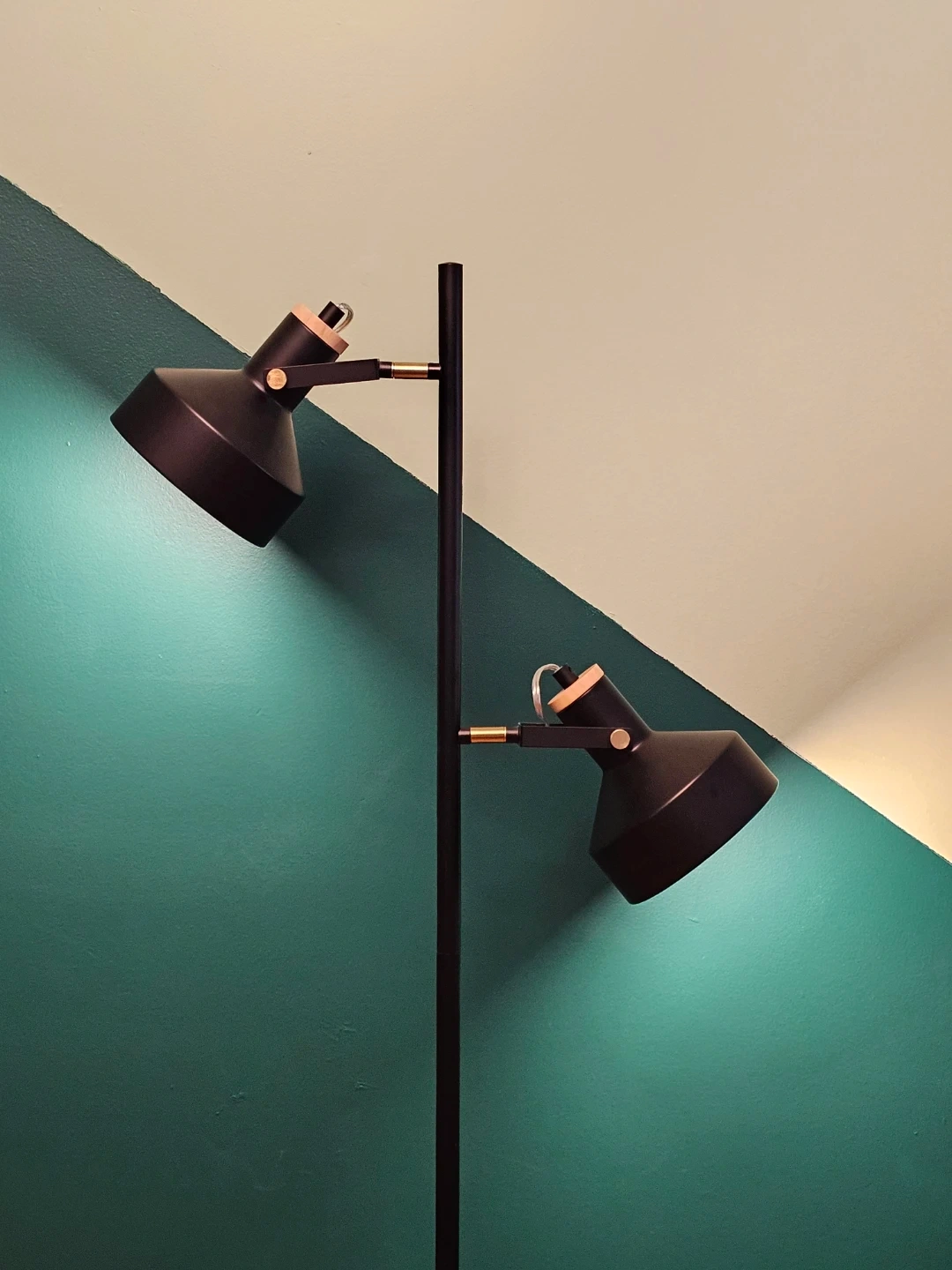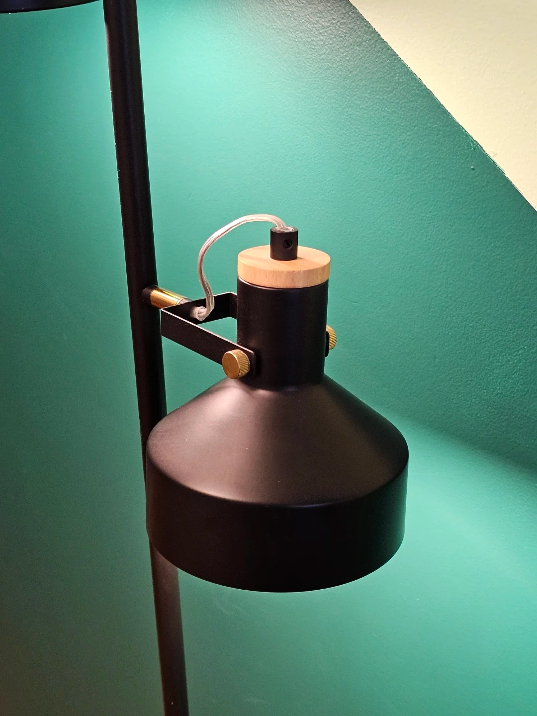 This black double-head floor lamp features adjustable lampshades with natural wood accents. Its slim profile and dual lighting make it a versatile addition to any room. Perfect for providing focused light for reading or ambient lighting.