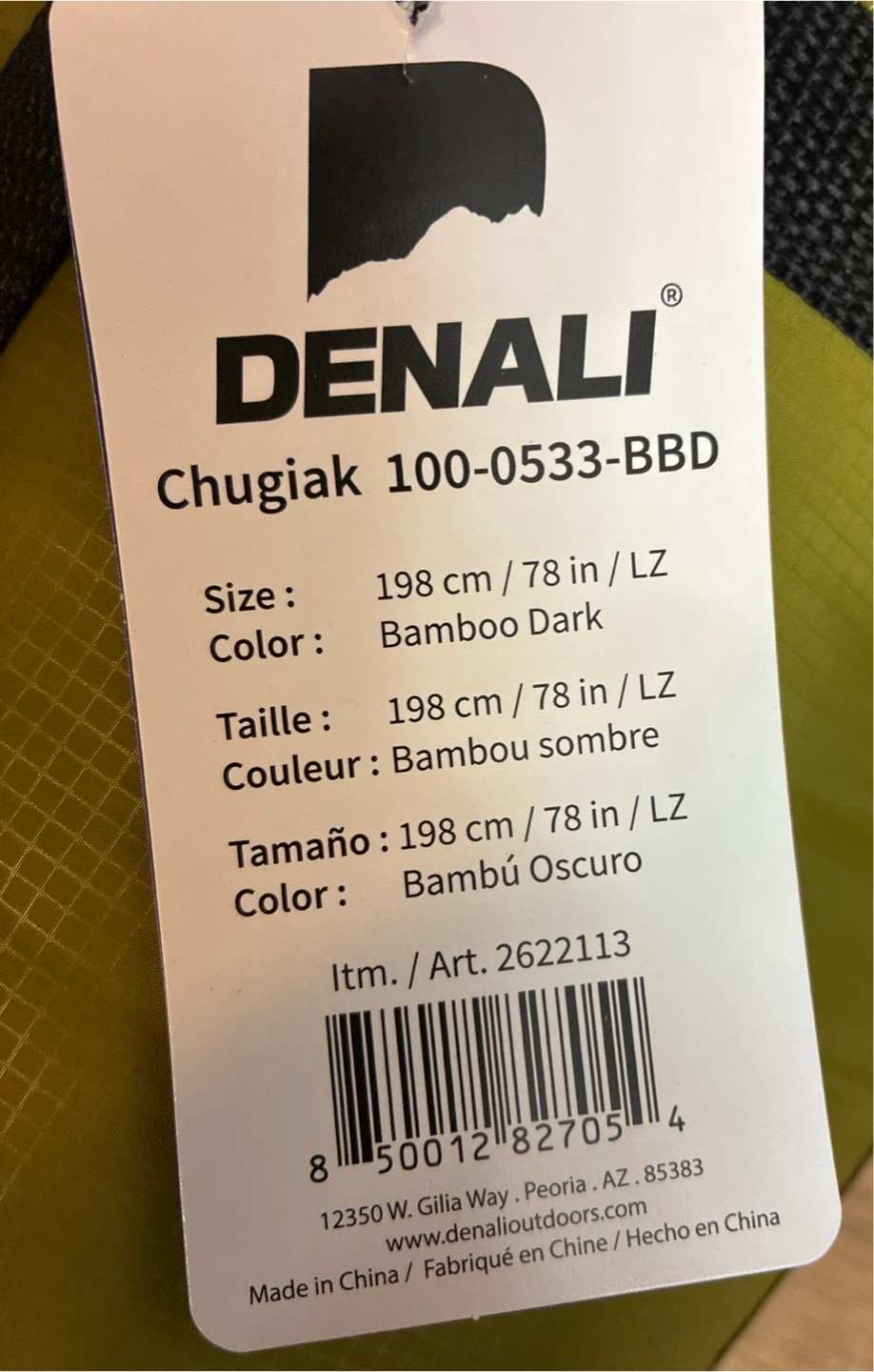 Denali Chugiak sleeping bag. It's a long size sleeping bag in Bamboo Dark colour. The temperature limit is -3.2°C / 26.2°F. It weighs 1.7 kg / 3.75 lb.