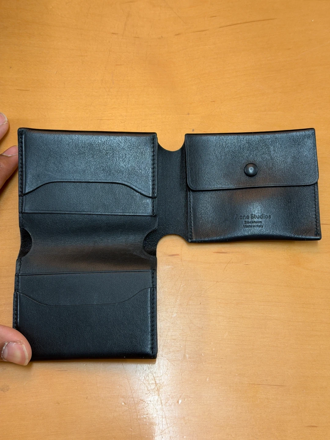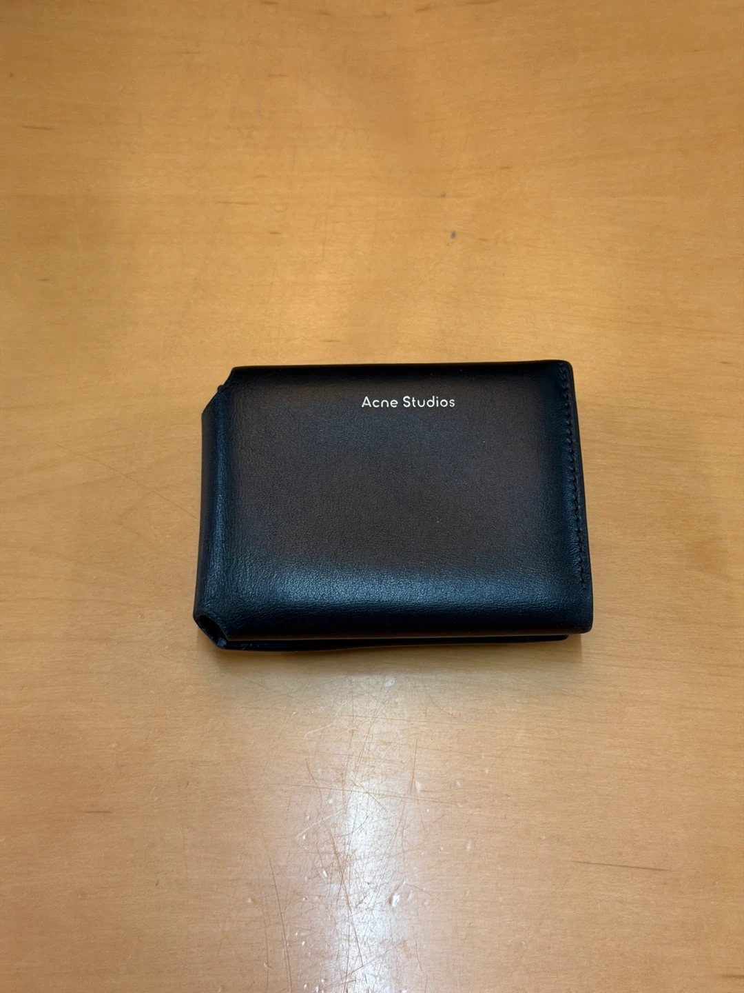Black leather bifold wallet from Acne Studios. It has multiple card slots and a coin pouch with a snap closure. Let me know if you want more photos or have any other questions.