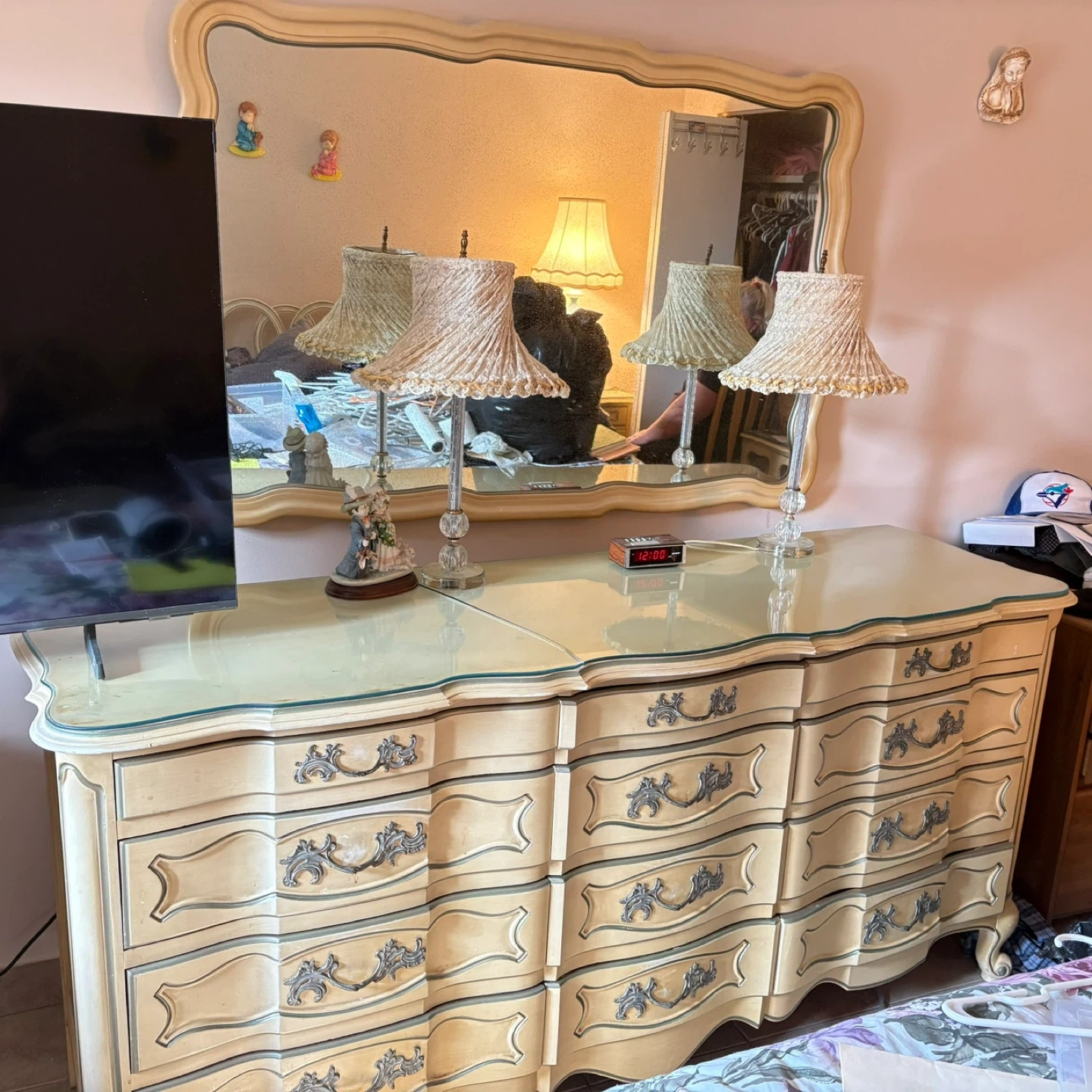 This beautiful dresser features a classic French Provincial design in a creamy off-white finish. It's made of wood and has ornate silver-tone hardware. Comes with a matching large mirror. Plenty of drawer space for all your bedroom essentials! Vintage, from 1900’s. Made to last. Must pick up west end