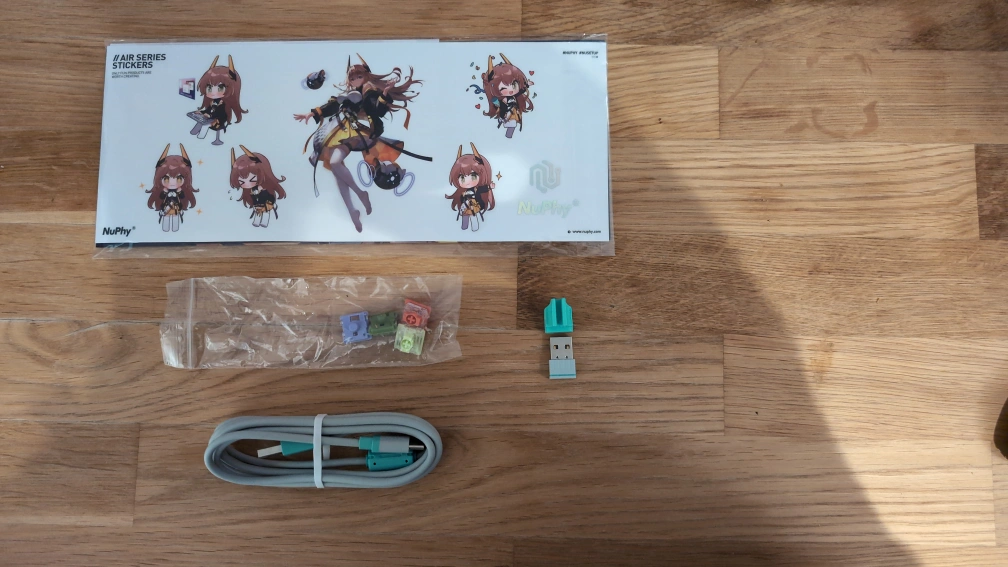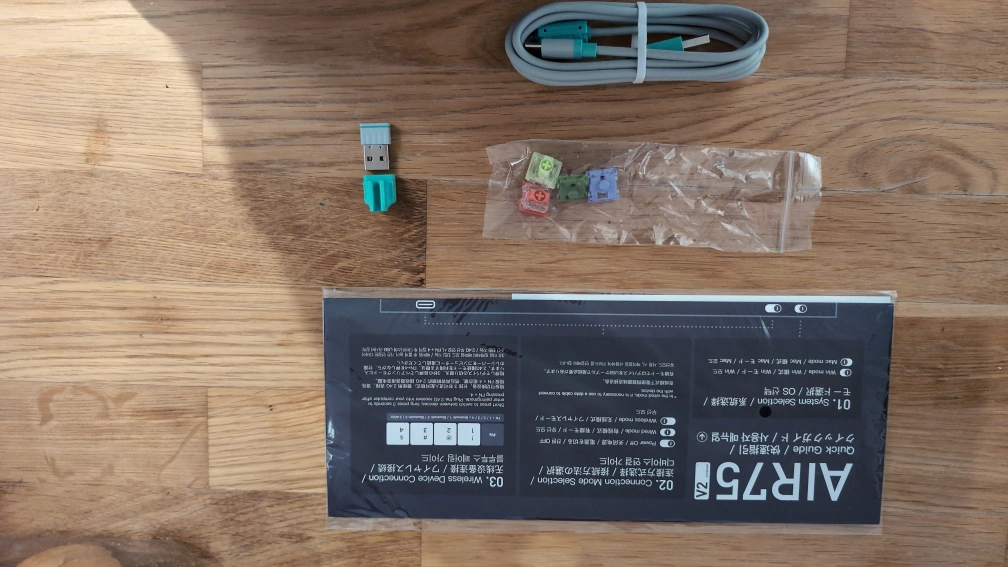 Nuphy Air75 V2 with 75% layout, white and grey, includes extra keycaps and cables, extra switches.. Bluetooth and USB-C connection are buggy and do not work well. Wired mode works flawlessly as well as all other functions. Comes with original accessories and packaging.