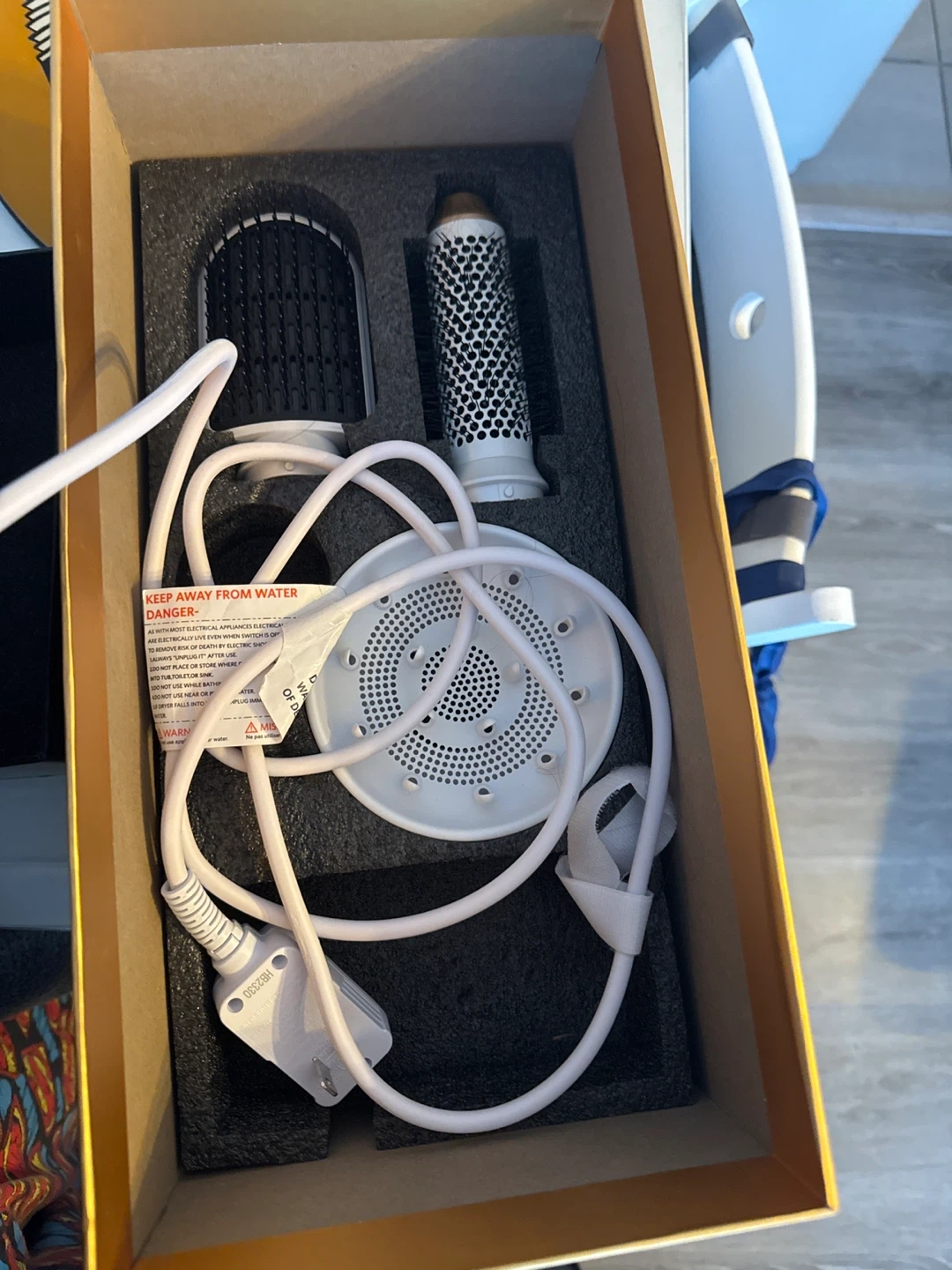 Selling a brand new 7 in 1 Pro Hair Styler Complete! It comes with all the attachments, including the drying head, straightening comb, round comb, left and right curling barrels (30mm), diffuse nozzle, and concentrated nozzle. It's still in its original box, ready for a new owner to try out all the different styles!