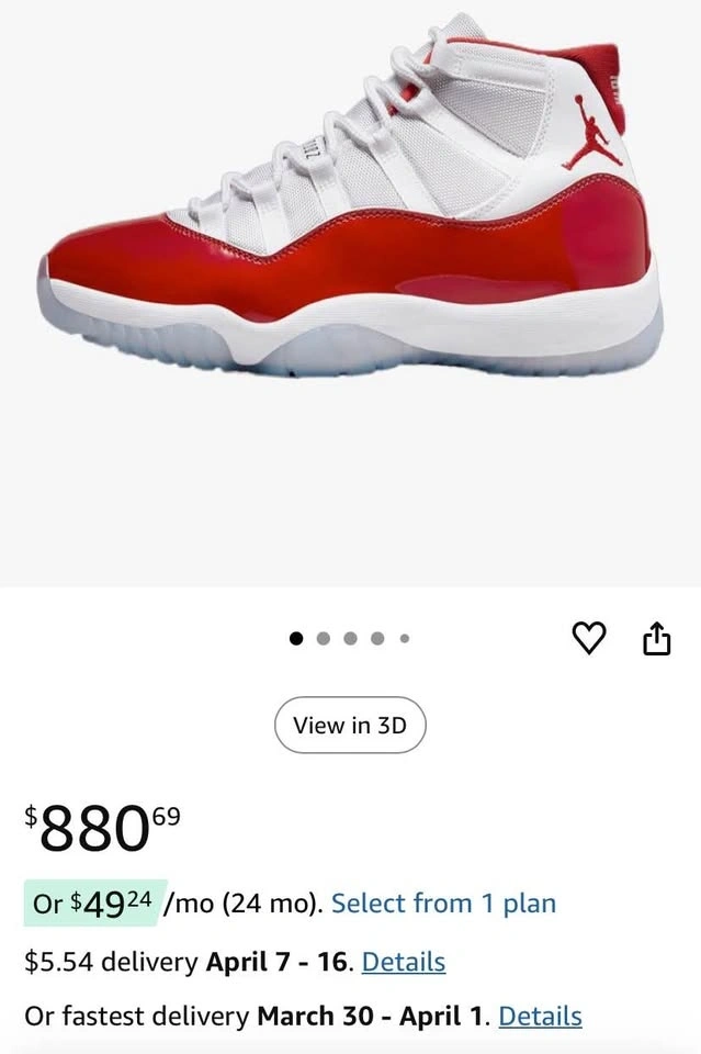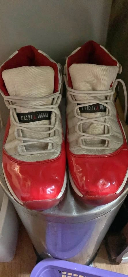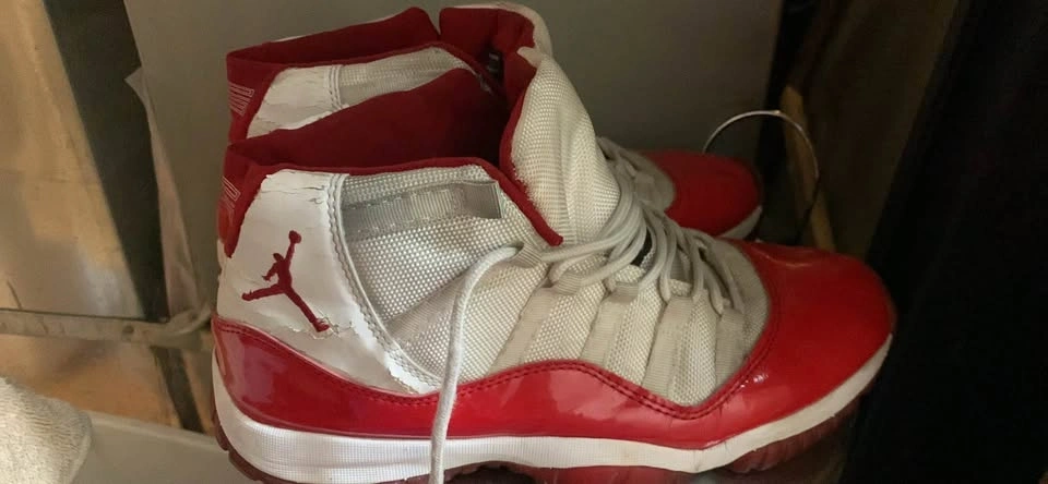 Classic Air Jordan 11s in red and white. These sneakers have red patent leather, white mesh upper, and white laces. Jumpman logo is on the side and back heel. 'JORDAN' is on the tongue tag.