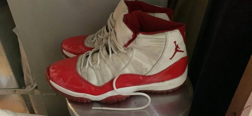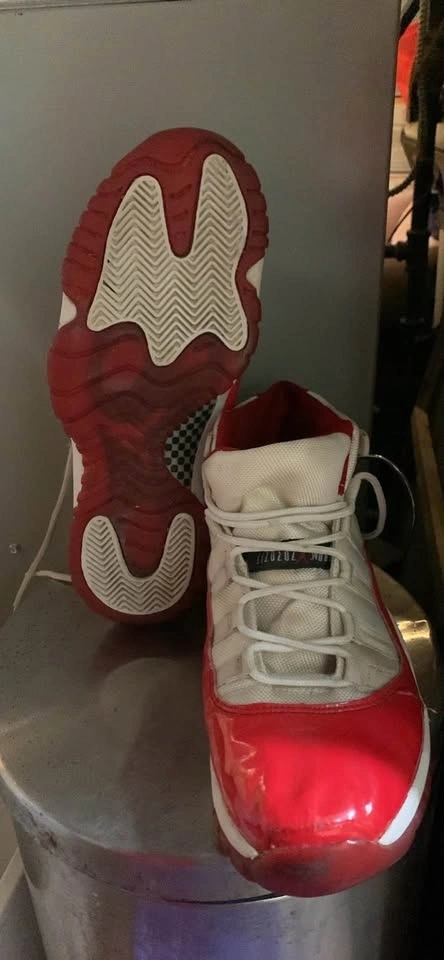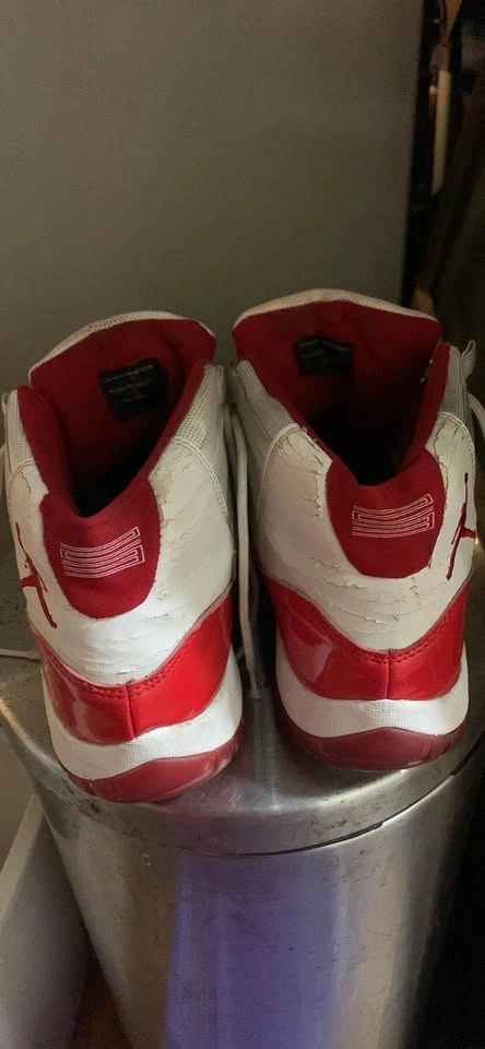 Classic Air Jordan 11s in red and white. These sneakers have red patent leather, white mesh upper, and white laces. Jumpman logo is on the side and back heel. 'JORDAN' is on the tongue tag.