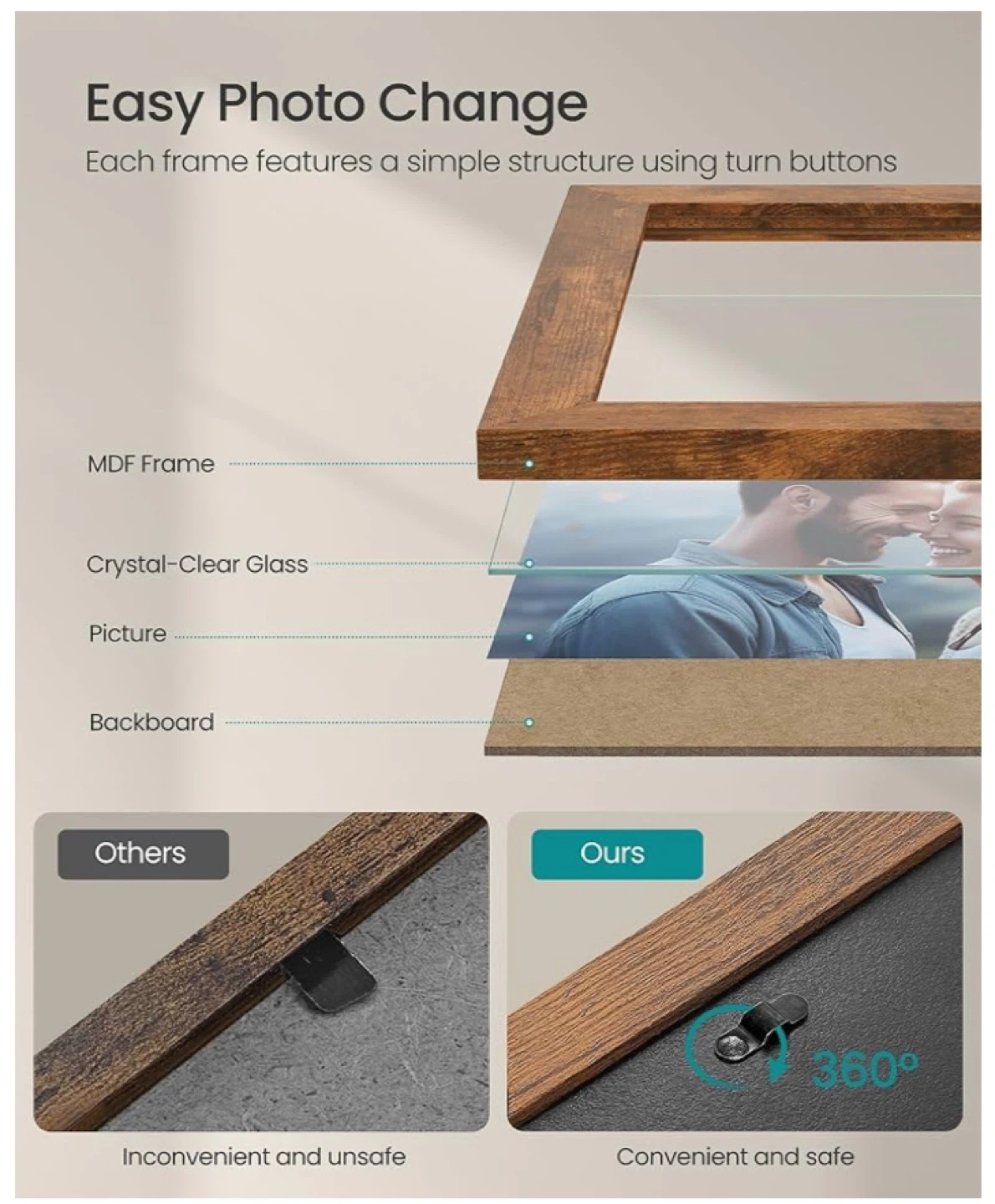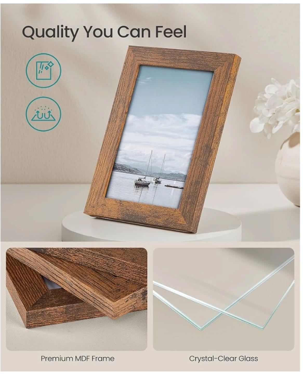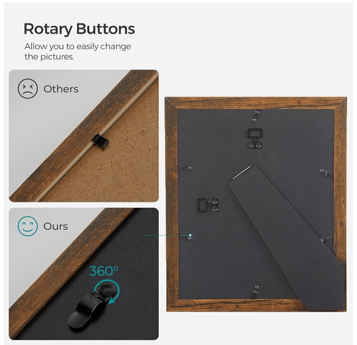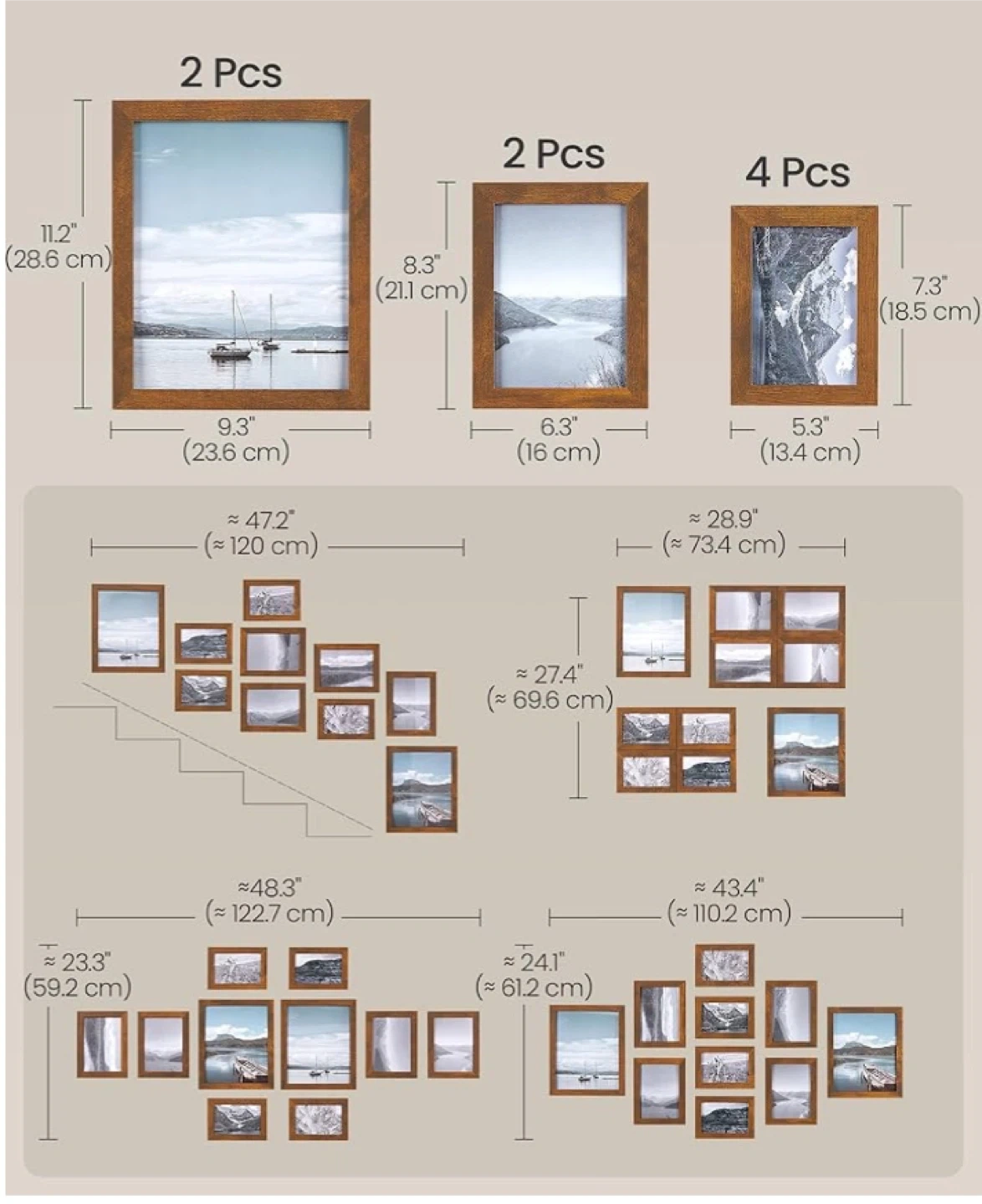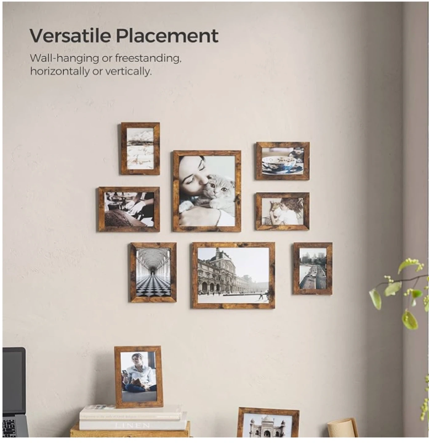 This SONGMICS photo frame set includes nine wooden frames in a rustic finish. Each frame is made with MDF and crystal-clear glass, featuring easy turn-button closures for quick photo changes. They're designed for versatile placement, whether wall-hanging or freestanding, horizontally or vertically.