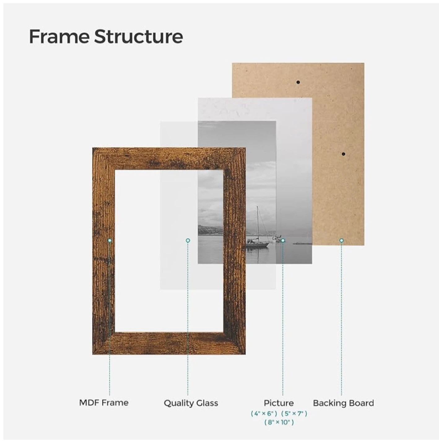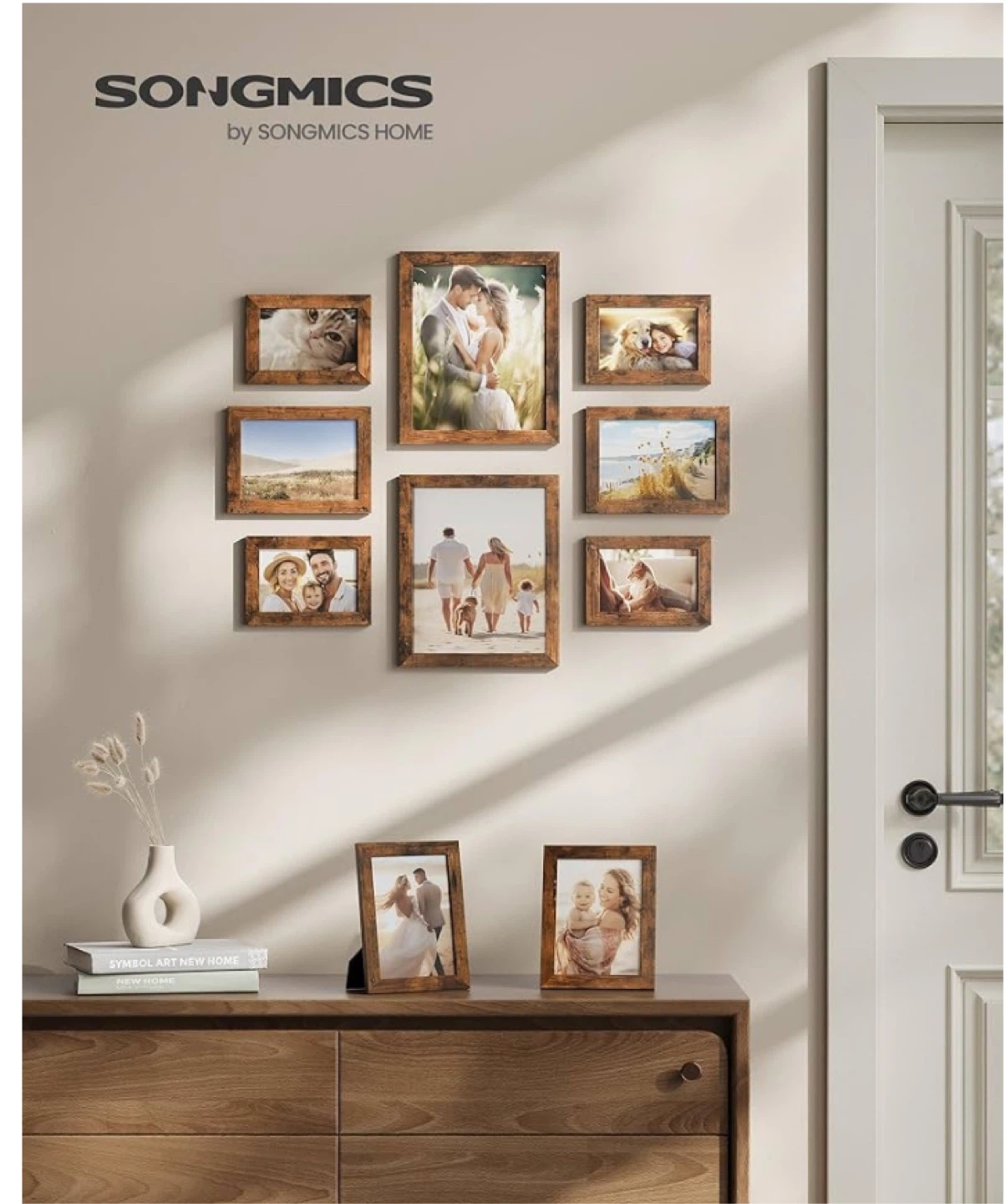 This SONGMICS photo frame set includes nine wooden frames in a rustic finish. Each frame is made with MDF and crystal-clear glass, featuring easy turn-button closures for quick photo changes. They're designed for versatile placement, whether wall-hanging or freestanding, horizontally or vertically.