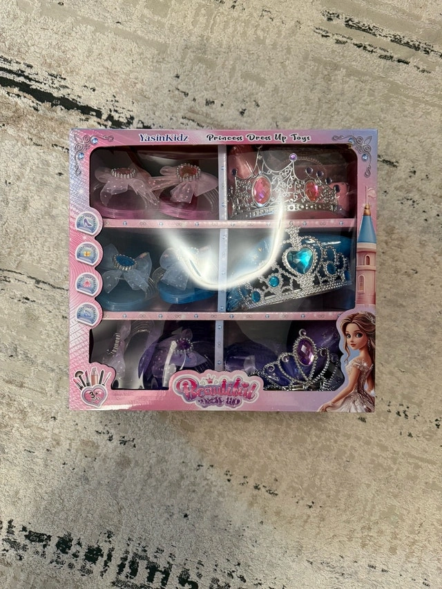 Sparkle and shine with this YASINKIDZ princess dress-up set for girls, including makeup, jewellery, dresses, shoes, and crowns, perfect for little ones aged 3-6! This set is nearly new, with all pieces in excellent condition. Let your little princess's imagination soar as she plays dress-up with this enchanting collection. Includes a variety of dresses, skirts, and tops, several pairs of shoes, a selection of crowns, and makeup and jewellery accessories. Unleash your child's inner royalty with this dazzling dress-up set! If the ad is still up, the item is available for purchase. This set is in excellent condition.