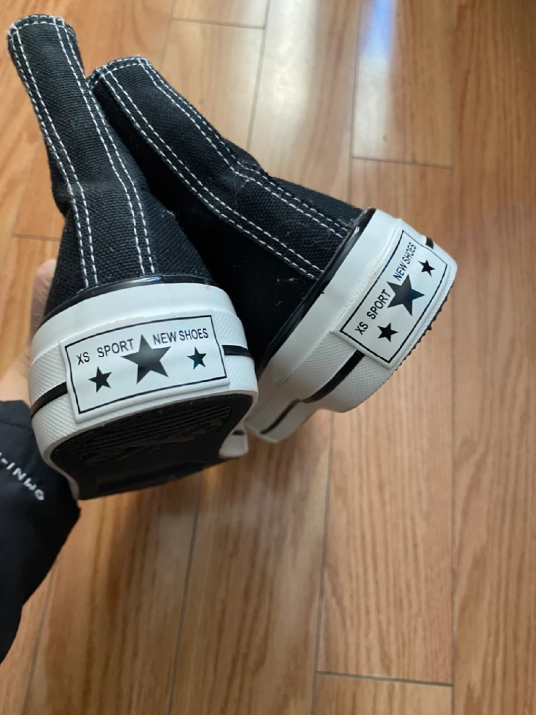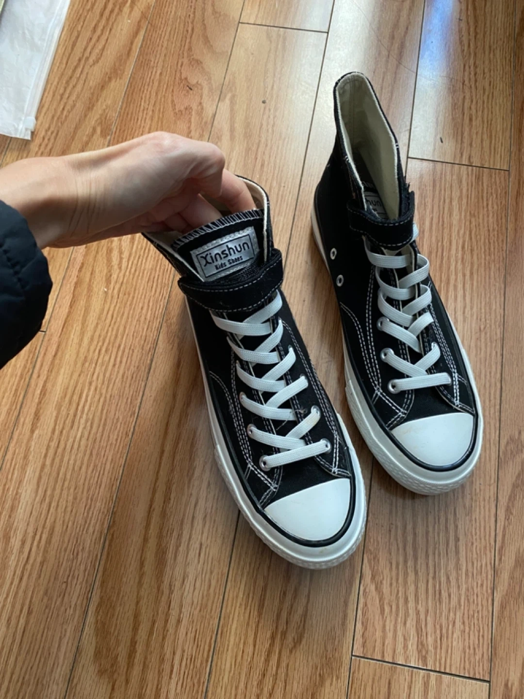 Here are some Xinshun Kids black high-top sneakers. Size 7.5 for big kids or men.