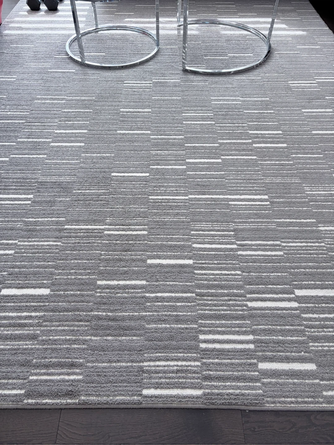 This area rug features a modern geometric pattern with grey and white tones. Its textured surface adds a cozy feel to any room. It's a great addition to living spaces or bedrooms!