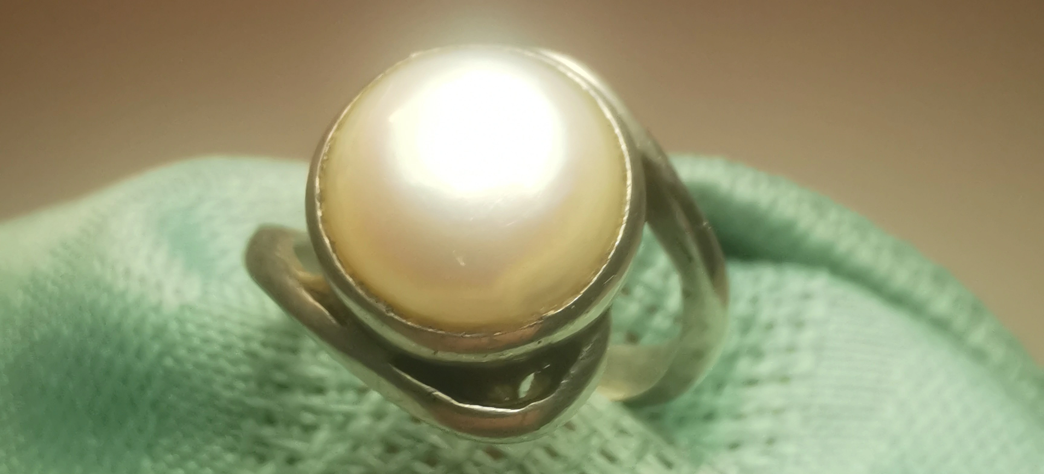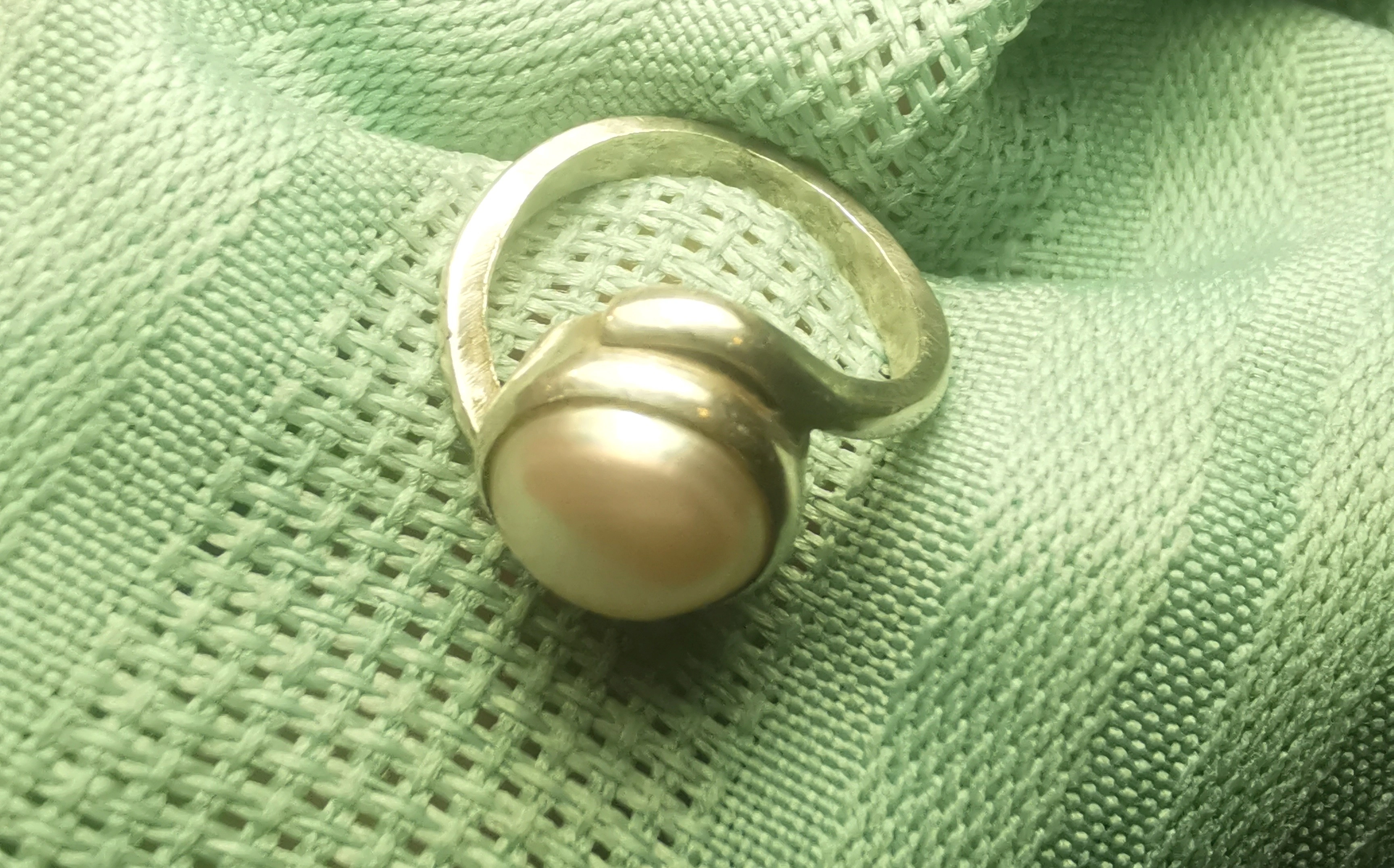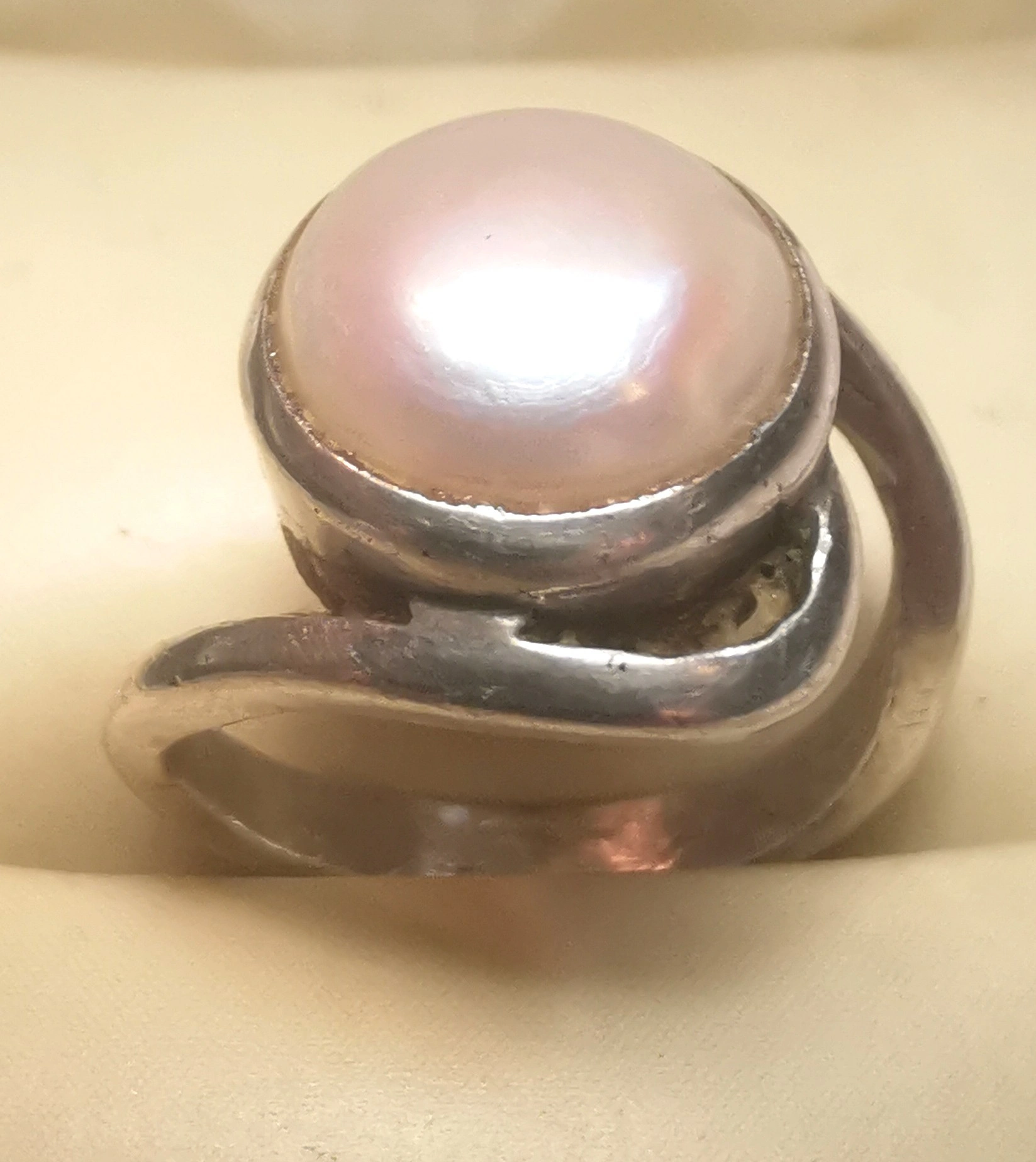 This is a striking vintage artisan ring featuring a large 10mm pearl (likely mabe or blister style) nestled in an organic, flowing bypass setting. The design is reminiscent of the modernist studio jewelry movement of the 1970s, offering a bold yet sophisticated look. Its petite size makes it an ideal choice for a pinky ring or for those with smaller frame sizes.