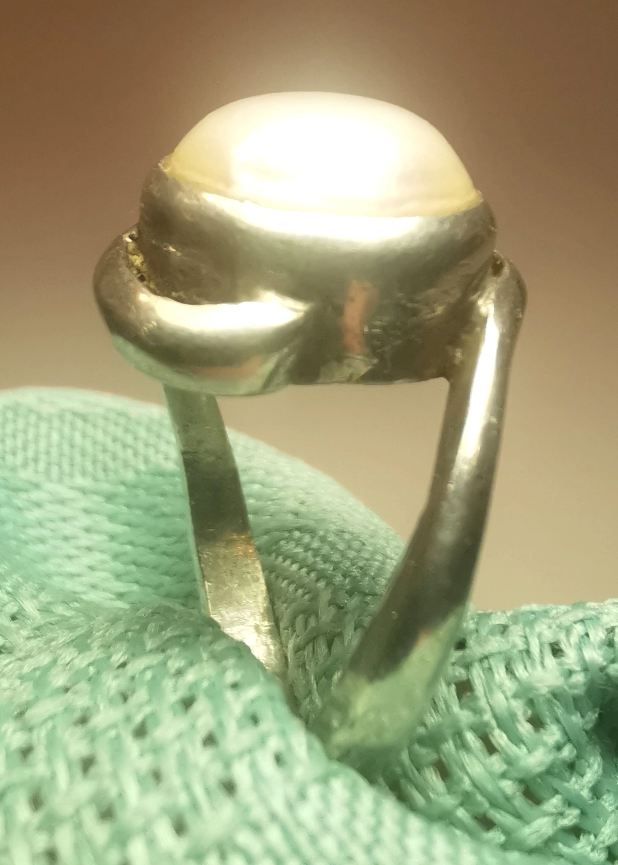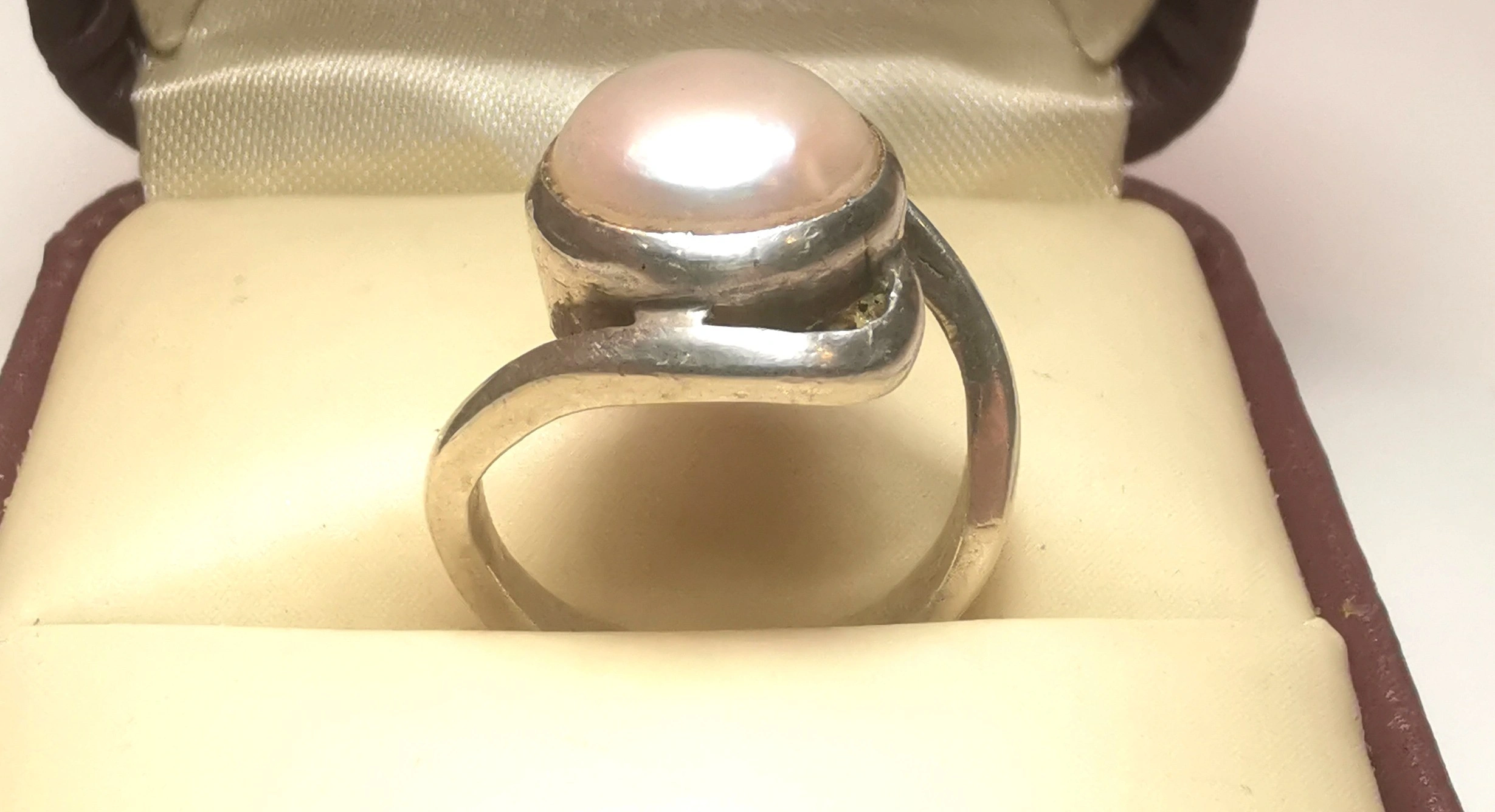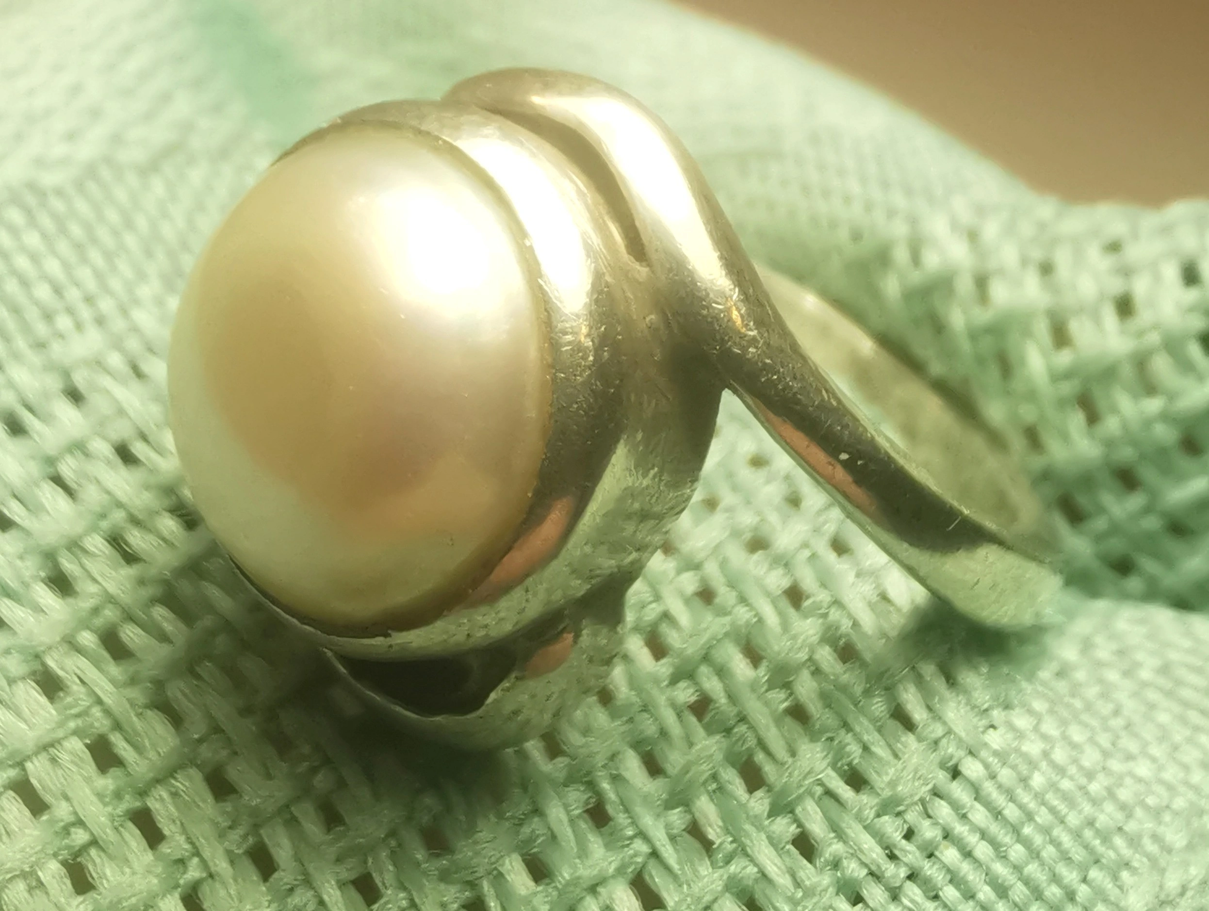 This is a striking vintage artisan ring featuring a large 10mm pearl (likely mabe or blister style) nestled in an organic, flowing bypass setting. The design is reminiscent of the modernist studio jewelry movement of the 1970s, offering a bold yet sophisticated look. Its petite size makes it an ideal choice for a pinky ring or for those with smaller frame sizes.