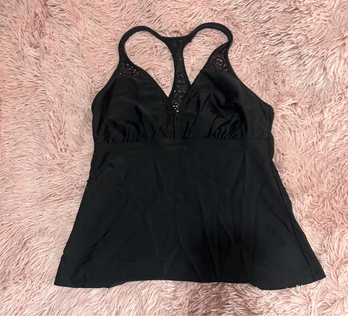 This black tankini top features a flattering v-neck with lace detailing at the bust and back. It's designed with a racerback for support. Great for swimming or lounging by the water!