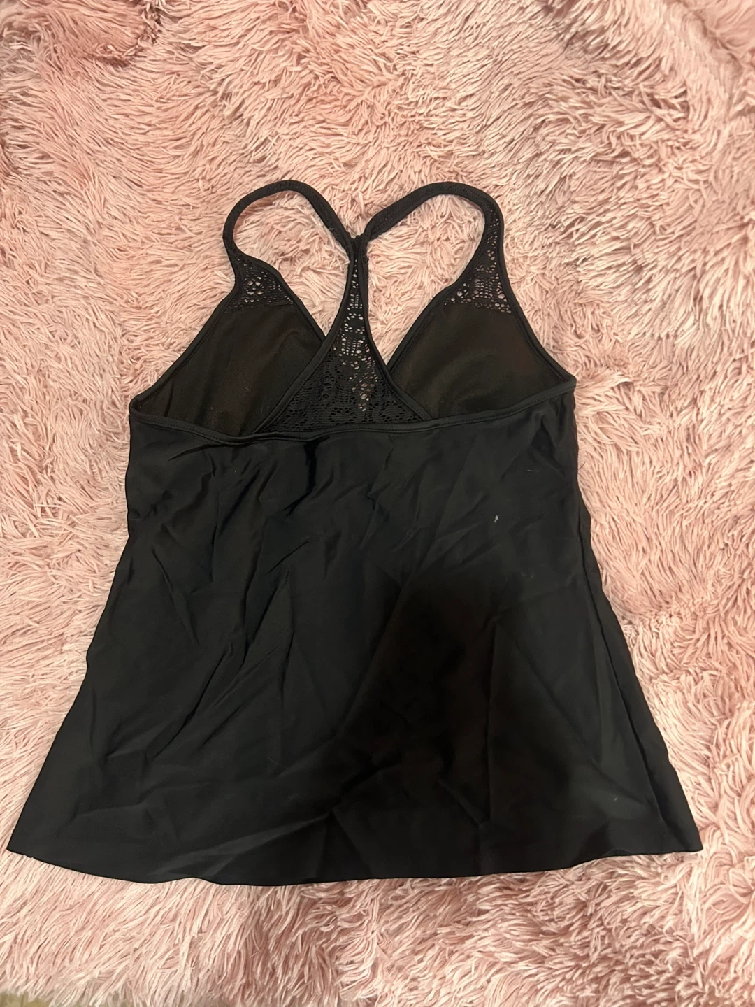 This black tankini top features a flattering v-neck with lace detailing at the bust and back. It's designed with a racerback for support. Great for swimming or lounging by the water!