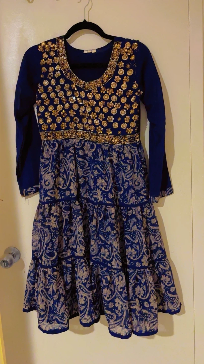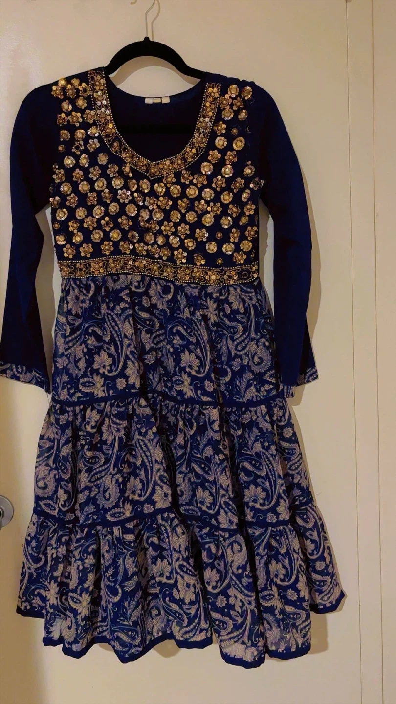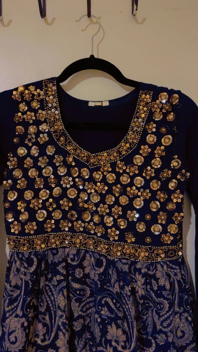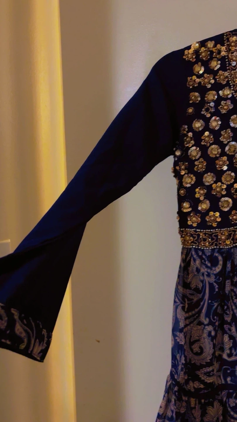Beautiful navy blue dress with intricate gold beadwork and sequins on the bodice. It features long bell sleeves and a tiered skirt with a paisley pattern. This dress is perfect for special occasions or festive events! like eid, diwali, holi, or westre parties