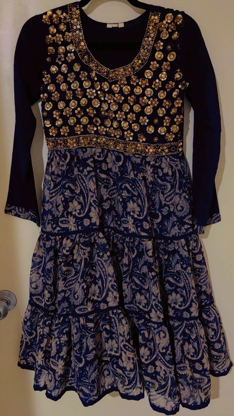 Beautiful navy blue dress with intricate gold beadwork and sequins on the bodice. It features long bell sleeves and a tiered skirt with a paisley pattern. This dress is perfect for special occasions or festive events! like eid, diwali, holi, or westre parties