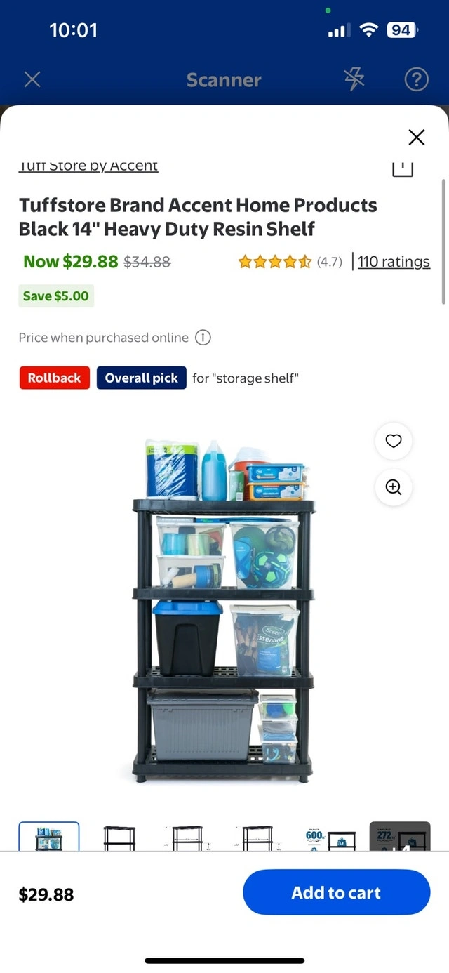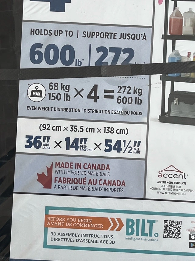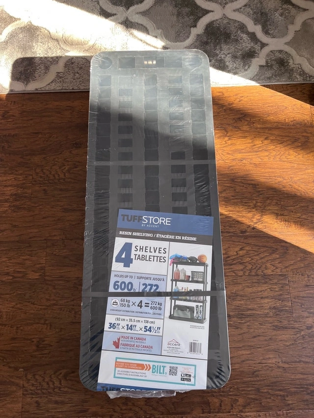 Keep your space organized with these new Tuff Store shelves. Each shelf can hold up to 150lbs, for a total weight capacity of 600lbs! The overall dimensions are 36" wide x 14" deep x 54 1/2" high. Made in Canada with imported materials. Cash accepted.