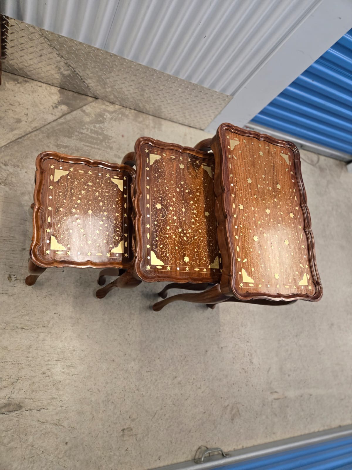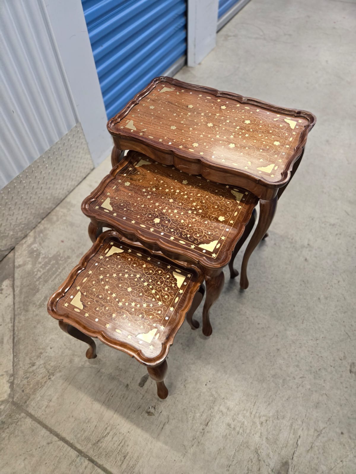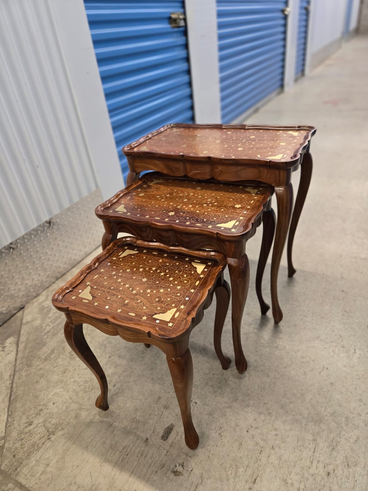 Set of 3 nesting tables with inlaid brass details. These tables are a great addition to any room. The tables are new in stock and ready to be enjoyed in your home.