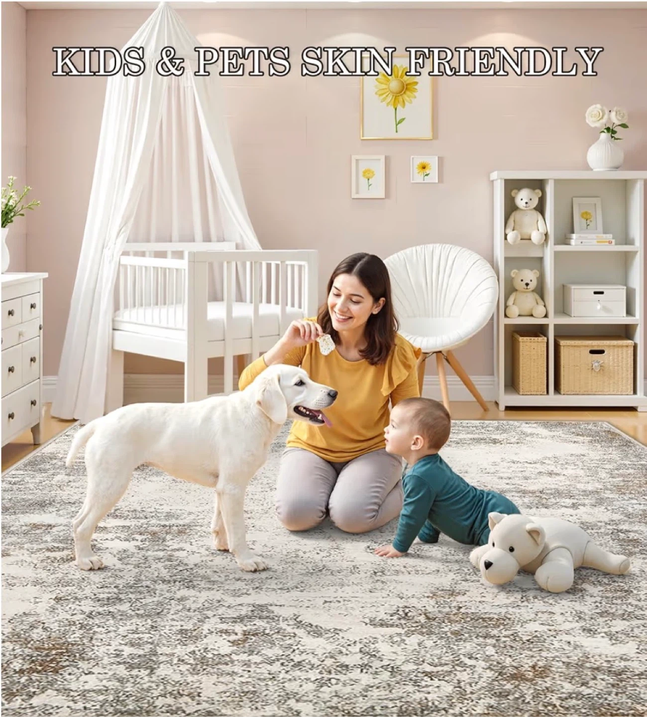 This area rug features a neutral abstract pattern that would look great in any room. It's perfect for adding a touch of style and comfort to your living space. It's also skin friendly for kids and pets