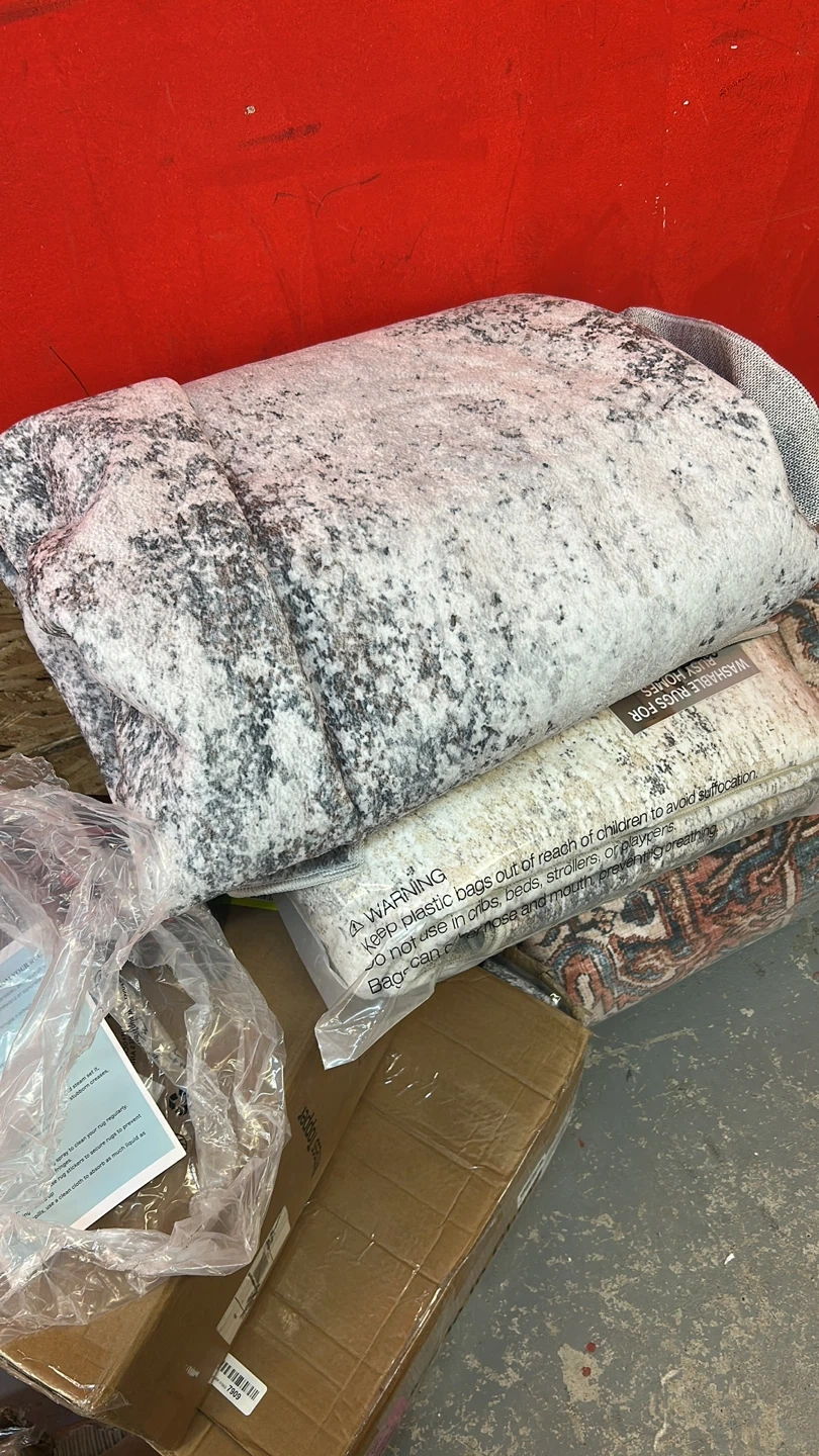 This area rug features a neutral abstract pattern that would look great in any room. It's perfect for adding a touch of style and comfort to your living space. It's also skin friendly for kids and pets