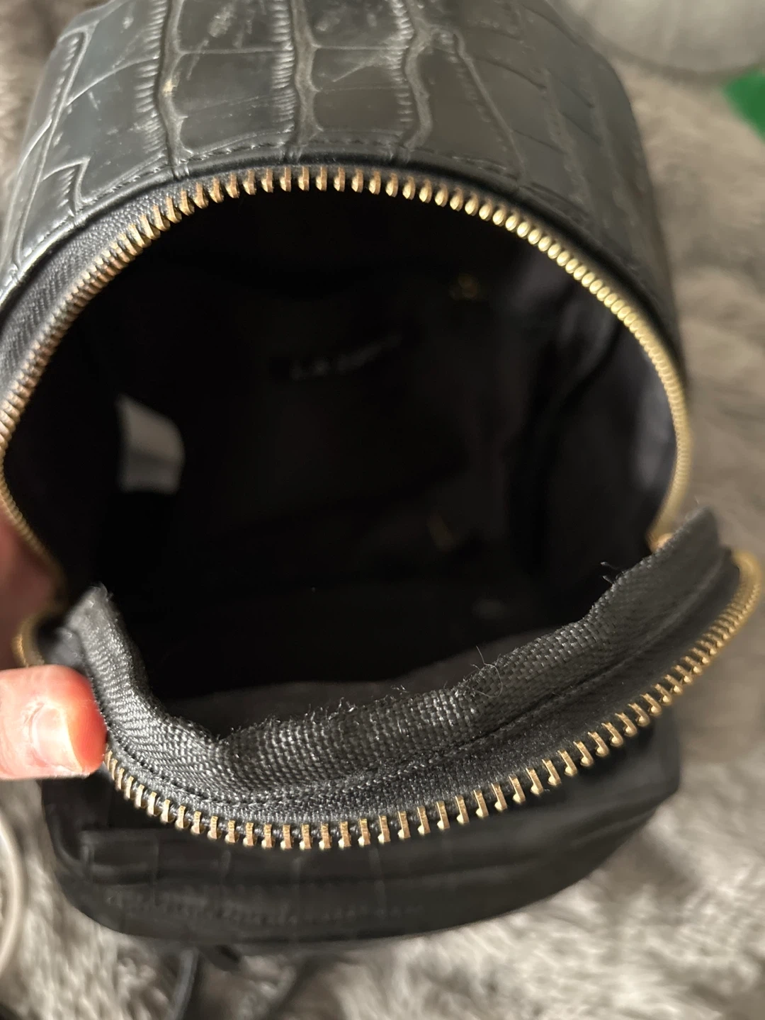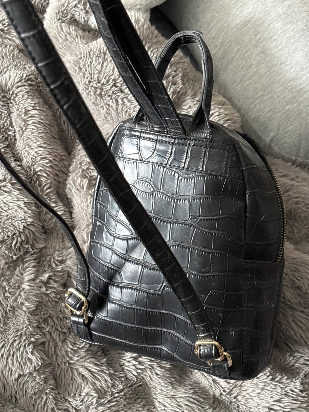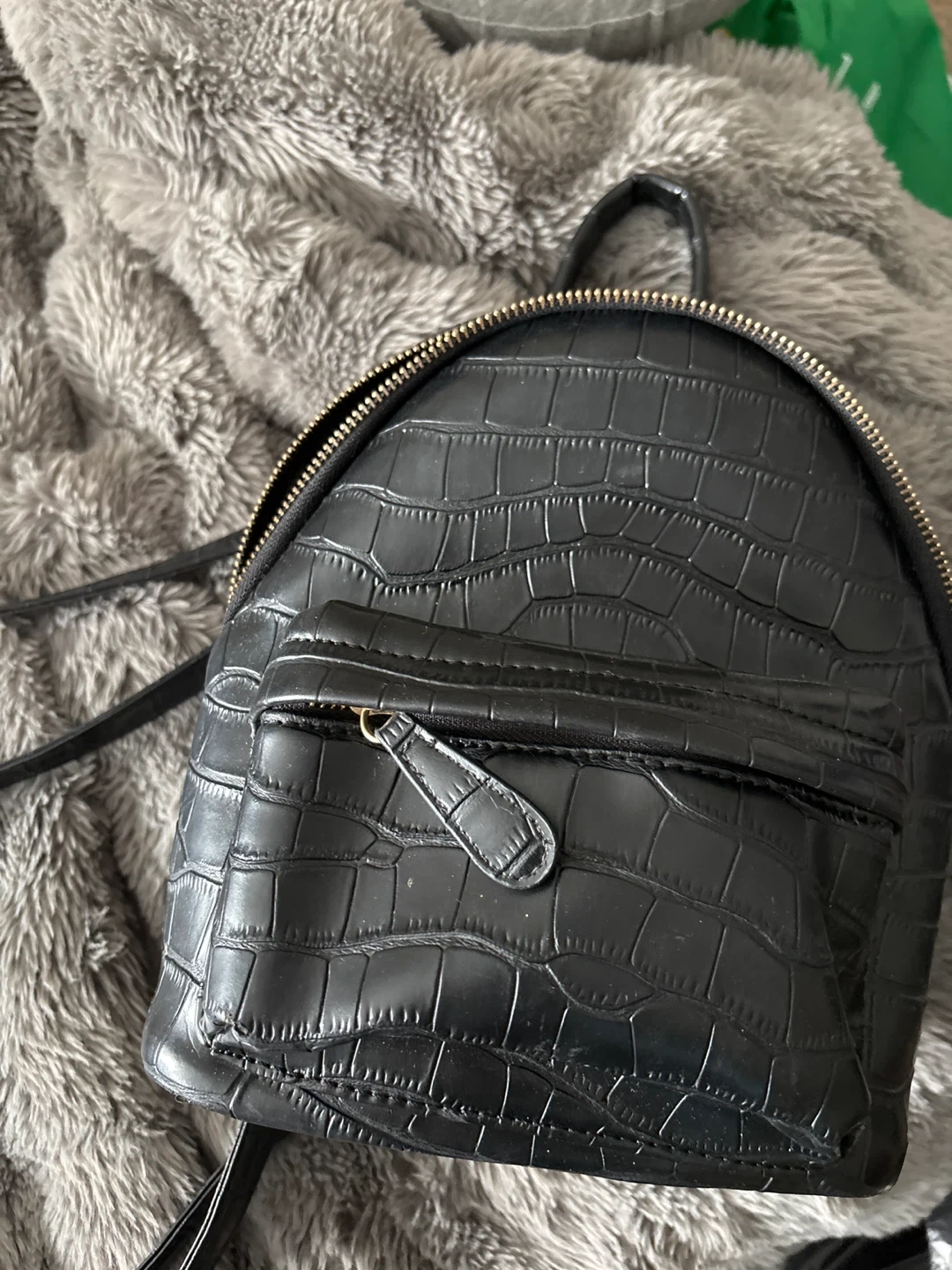 This is a stylish black faux crocodile mini backpack. It has a zippered main compartment and a front zippered pocket. It's a great size for essentials!