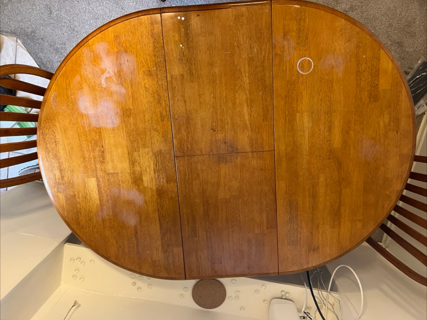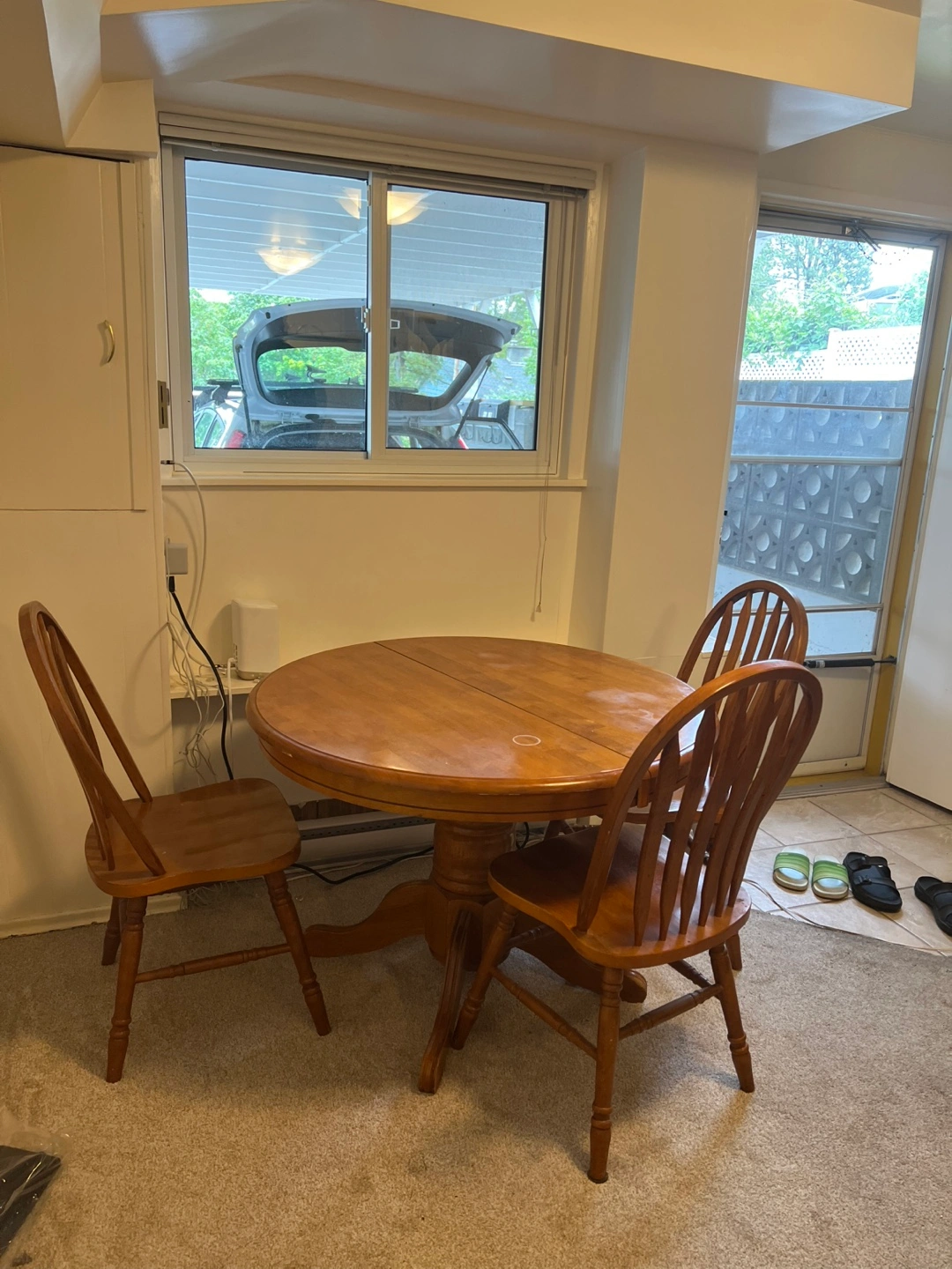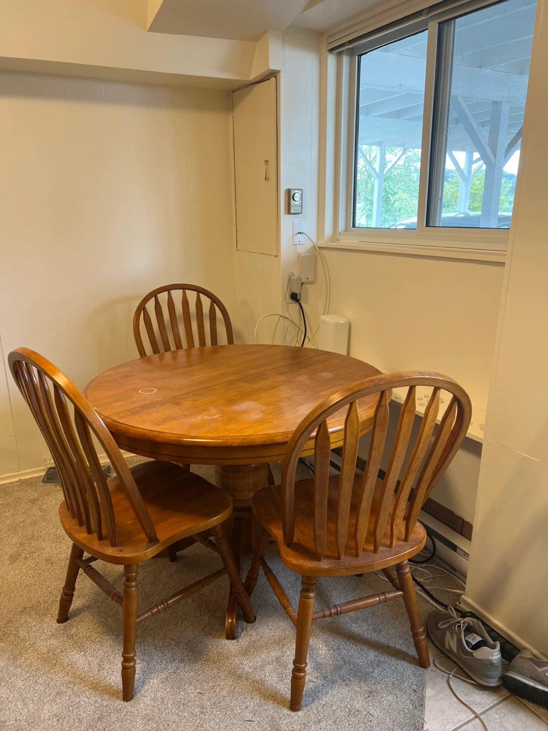 Selling a round wooden dining table with three chairs. It's a great set for a smaller dining area or kitchen. The table has a pedestal base and the chairs have a classic spindle back design. There are some signs of use on the table top, but overall it's in good condition and ready for a new home!